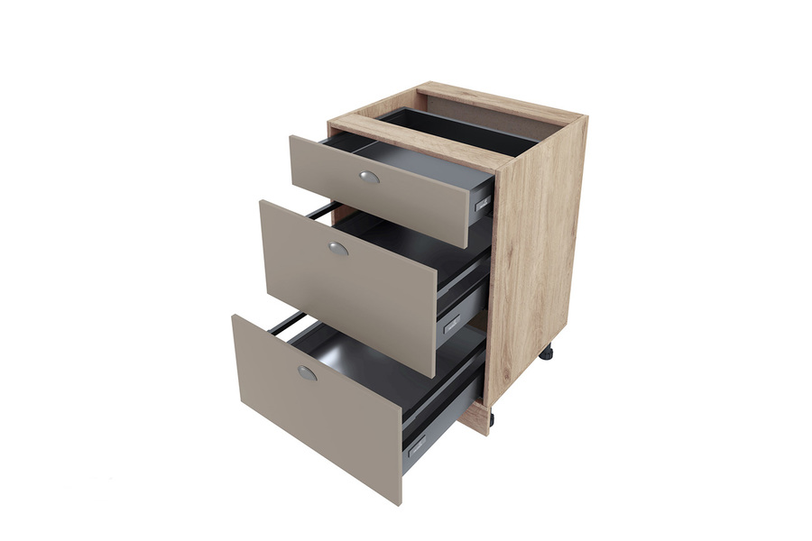 Долен шкаф с тре чекмеджета с плавно затваряне. Посоката на отваряне на вратичката се определя при монтажа ѝ.