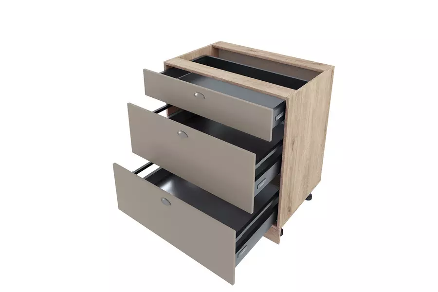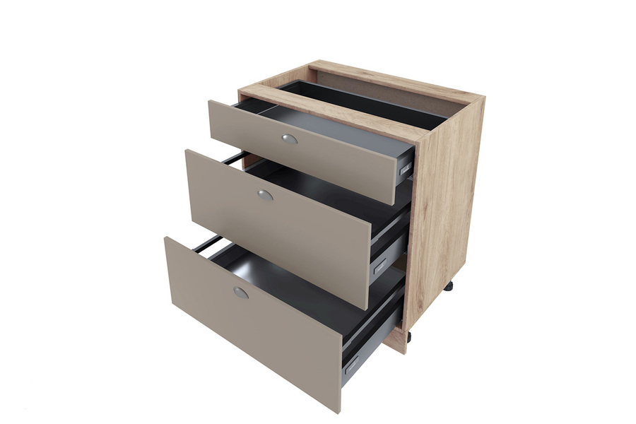 Долен шкаф с тре чекмеджета с плавно затваряне. Посоката на отваряне на вратичката се определя при монтажа ѝ.