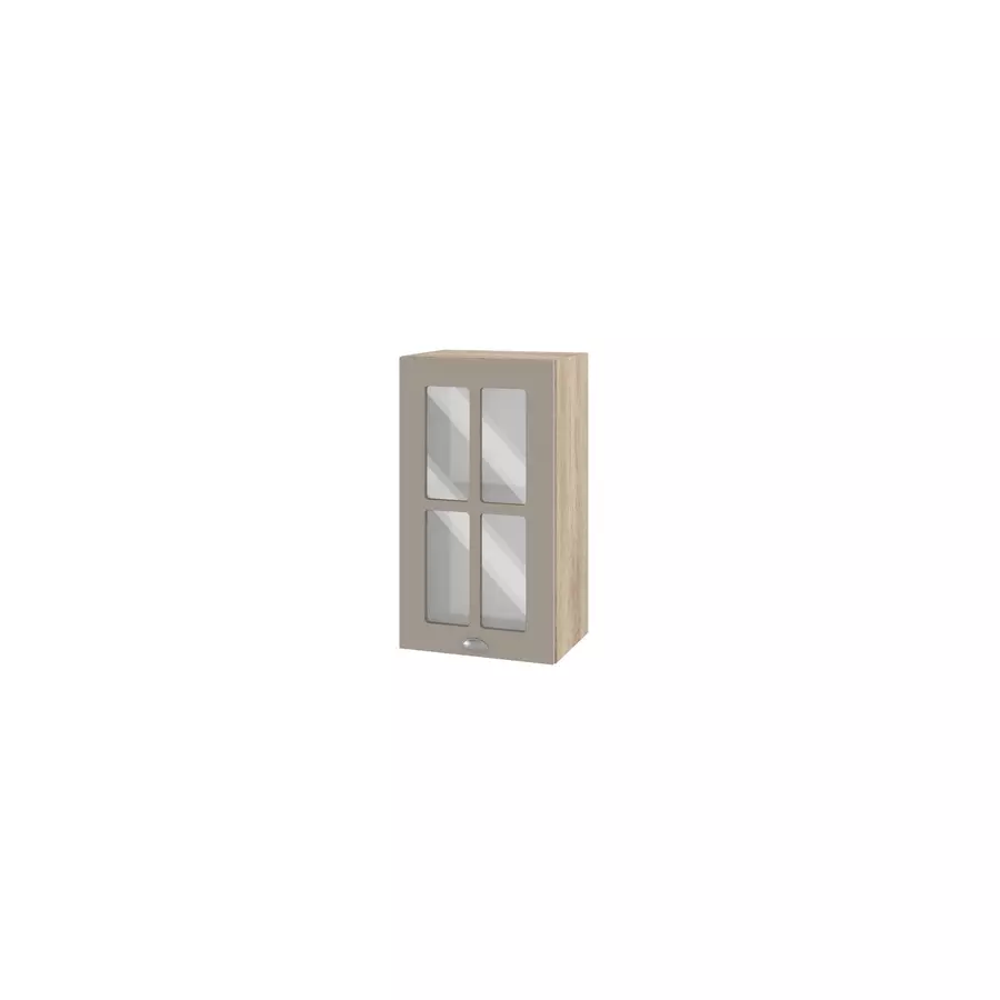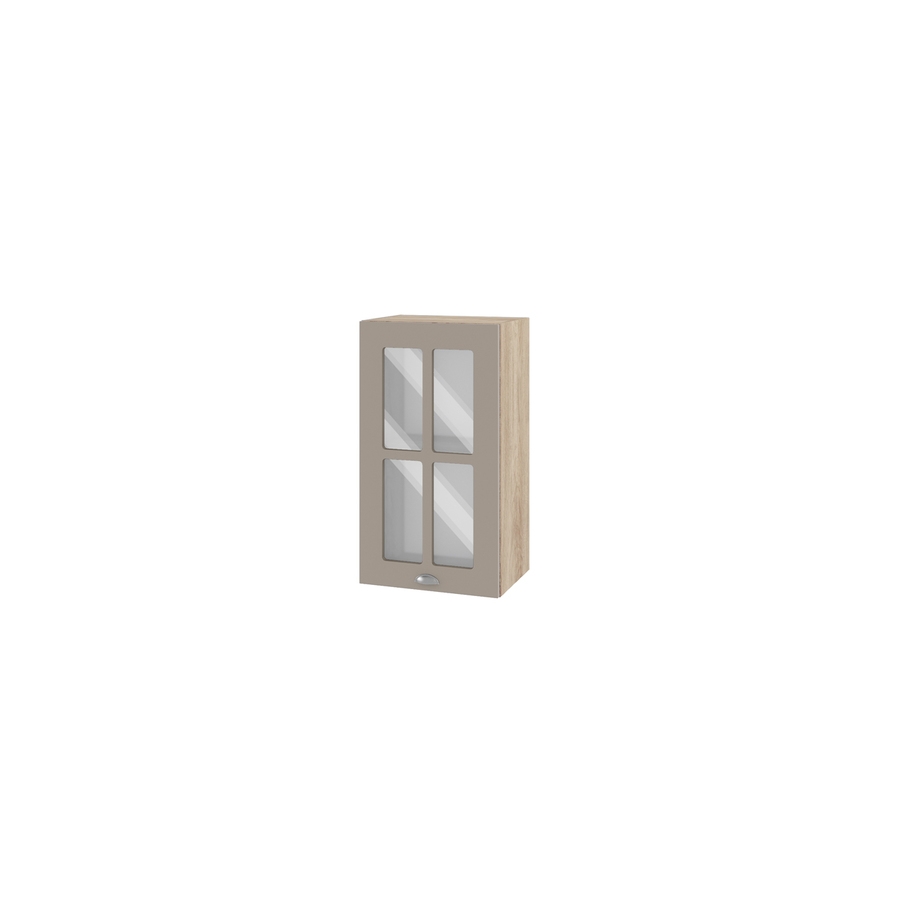 Горен шкаф с витрина и плавно затваряне. Посоката на отваряне на вратичката се определя при монтажа ѝ.