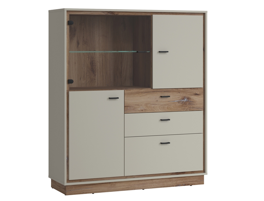 Витрината Ривиеро е изработена от ламинирано ПДЧ с метални дръжки и закалено стъкло. Атрактивен и модерен дизайн, асиметрична витрина се съчетава перфектно с предлаганото по желание LED осветление. В същото време тя създава просторна зона за съхранение на вещи, които не желаете да се виждат. Водачи и панти за плавно затваряне.