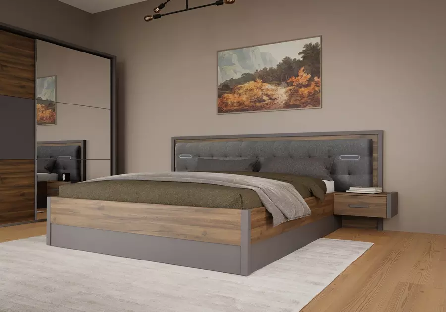 • Цвят и дизайн: Леглото е изпълнено в елегантен и съвременен стил, със светли и тъмни дървесни нюанси, които хармонично се вписват във всякакви интериорни решения.
