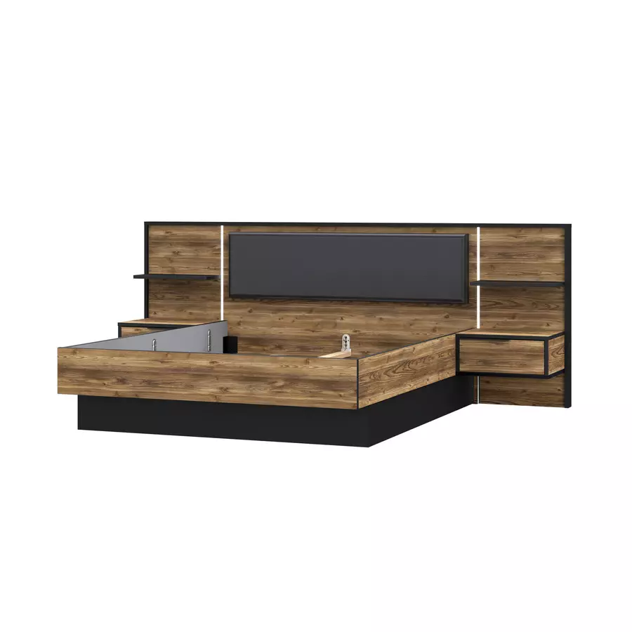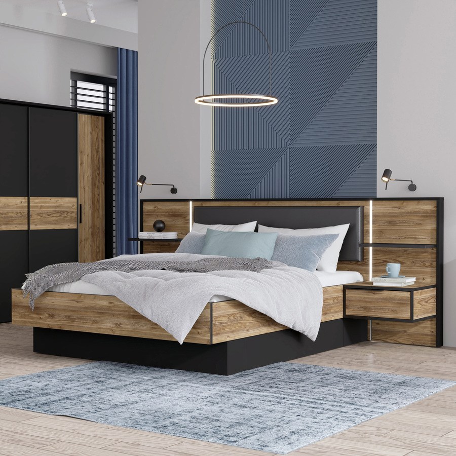 Нощни шкафчета: Комплектът включва две нощни шкафчета, интегрирани в дизайна, осигуряващи удобство и практичност за съхранение на лични вещи. Всяко шкафче разполага с просторно чекмедже с плавно затваряне.