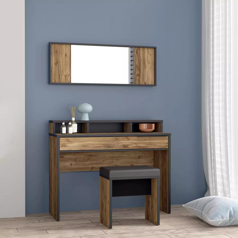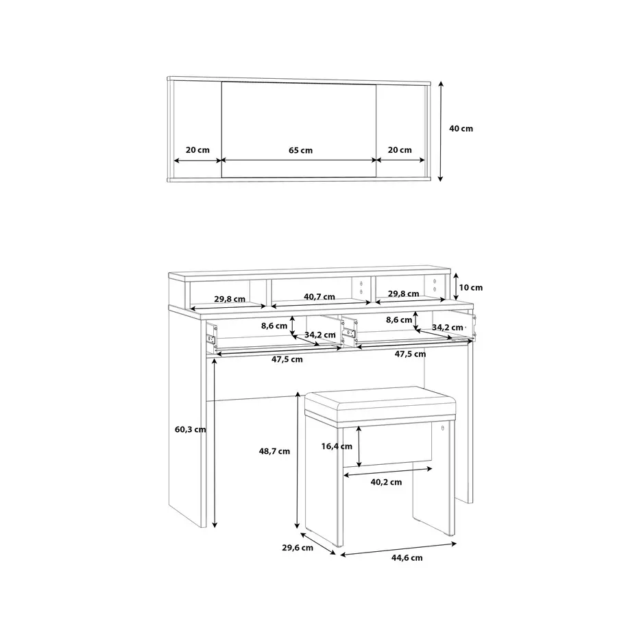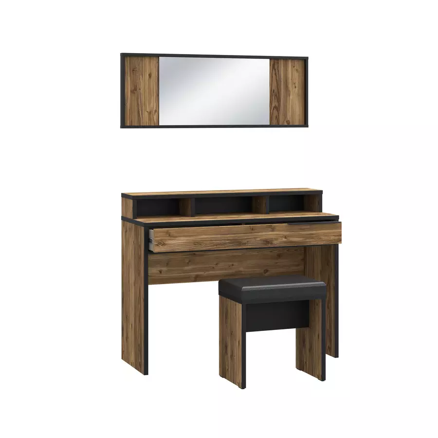 Тоалетката е изработена от ПДЧ, което осигурява здравина и издръжливост на конструкцията. Нейният модерен и изчистен дизайн се вписва чудесно в различни интериорни стилове – от минималистични до по-класически решения. Компактните размери на тоалетката я правят подходяща дори за по-малки пространства, като същевременно осигурява достатъчно място за съхранение на лични вещи.