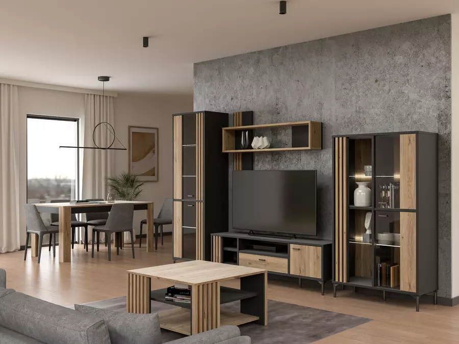 • ТВ шкаф: Проектиран с вратичка, чекмедже, рафт и ниша за телевизор, този шкаф осигурява удобно и стилно място за вашите медийни устройства. Нишата е достатъчно широка, за да побере повечето телевизори, докато чекмеджето предлага място за съхранение на дистанционни управления, кабели и аксесоари.