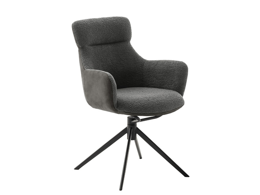 Вътрешната част на облегалката и седалката е тапицирана с елегантно букле, което придава текстурен и уютен вид, докато външната част е покрита с висококачествена алкантара – мек и издръжлив материал, който съчетава лукс и практичност. Алкантара е известна със своето приятно на допир усещане и лесно почистване, което добавя допълнителна стойност на стола.
