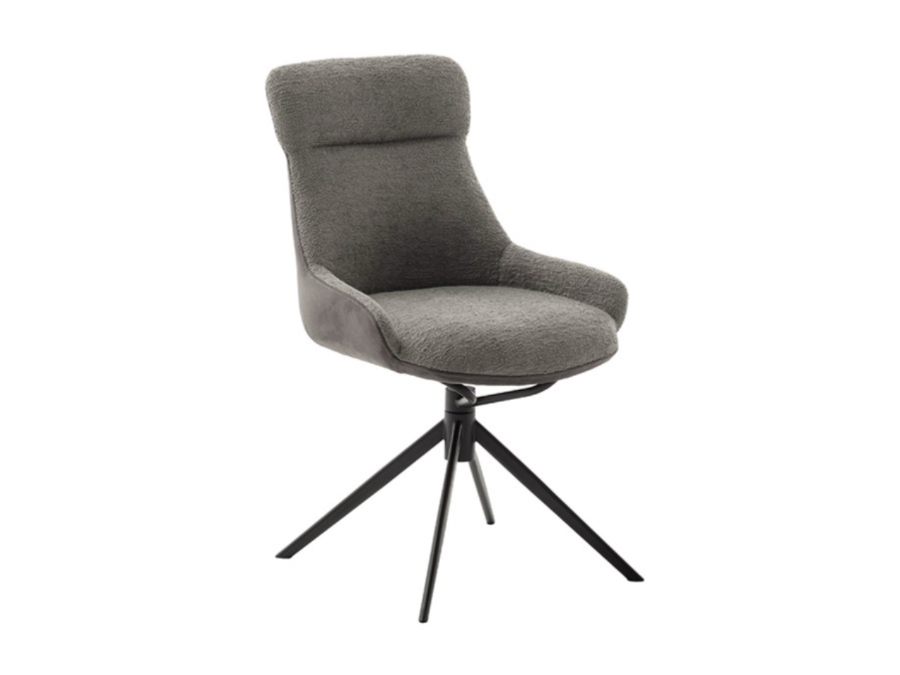 Вътрешната част на облегалката и седалката е тапицирана с елегантно букле, което придава текстурен и уютен вид, докато външната част е покрита с висококачествена алкантара – мек и издръжлив материал, който съчетава лукс и практичност. Алкантара е известна със своето приятно на допир усещане и лесно почистване, което добавя допълнителна стойност на стола.