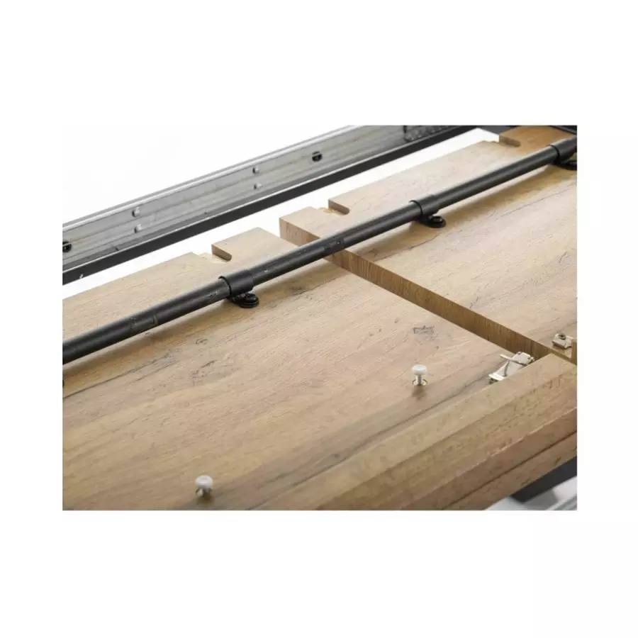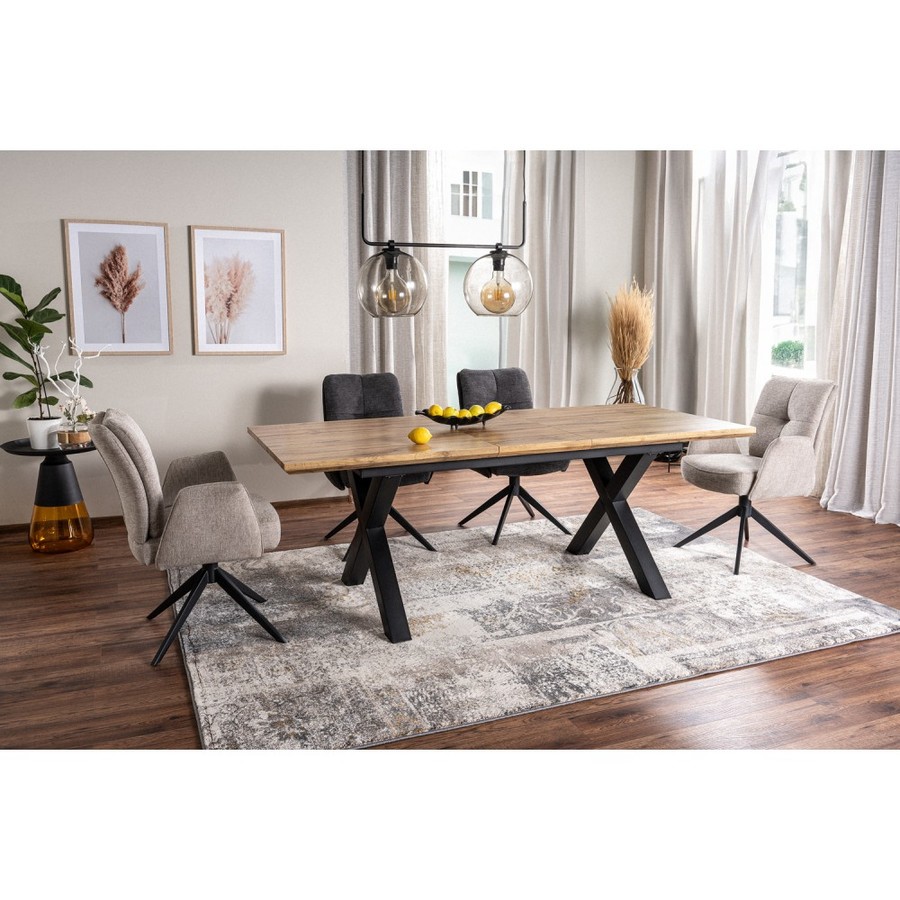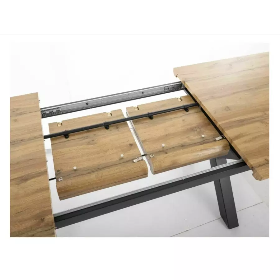 Разтегателната трапезна маса Хавиеро 2 впечатлява със своя елегантен и функционален дизайн, който съчетава здравина, практичност и естетика. Изработена от висококачествени материали, тя е проектирана да осигури максимален комфорт и устойчивост при ежедневна употреба. Плотът от МДФ с текстура в цвят дъб добавя естествено излъчване и топлина към интериора, създавайки усещане за уют и хармония. Здравата метална основа с черен матов завършек придава на масата модерен и индустриален вид, като същевременно гарантира стабилност и дълготрайност. Конструкцията е проектирана с внимание към детайла, като съчетава изчистени линии и иновативен дизайн, който лесно се адаптира към различни стилове на обзавеждане.