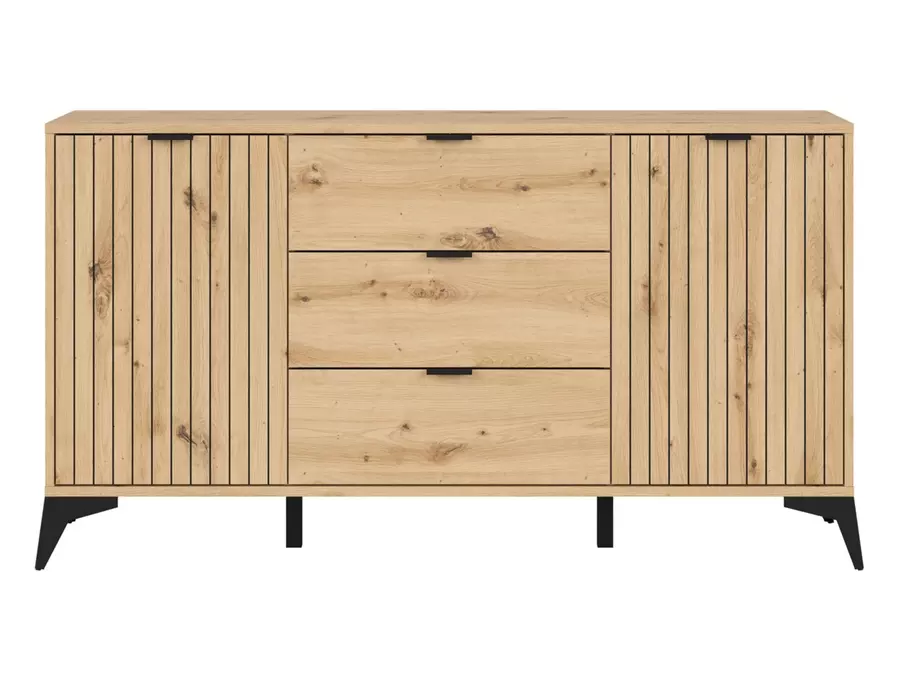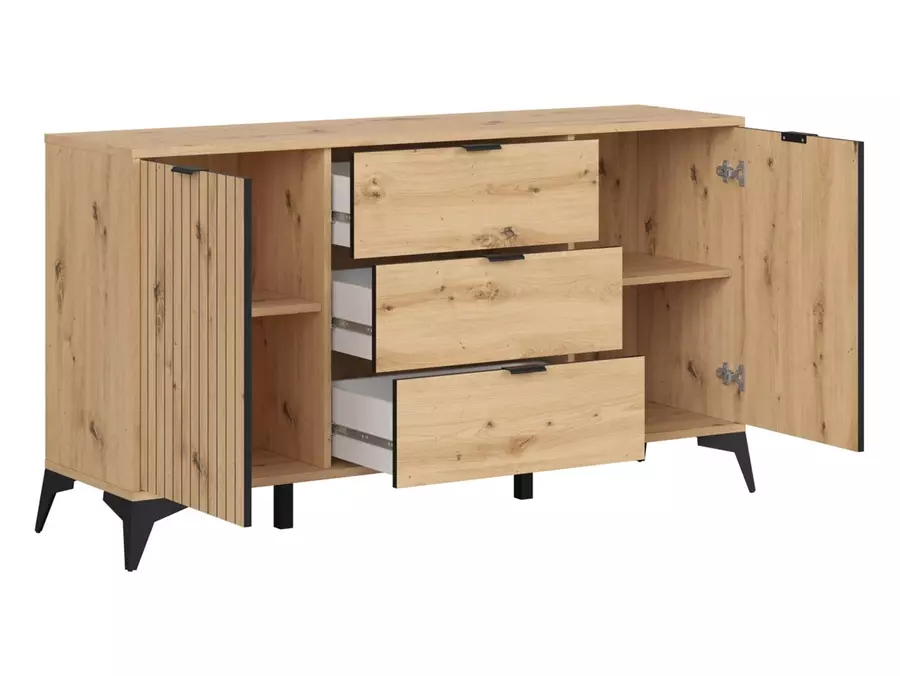 Скрин ЛАМЕА с ширина 150 см осигурява много място за съхранение в хола, офиса или спалнята. В централната част има 3 практични чекмеджета, а отстрани има 2 практични отделения разделени с рафт.
