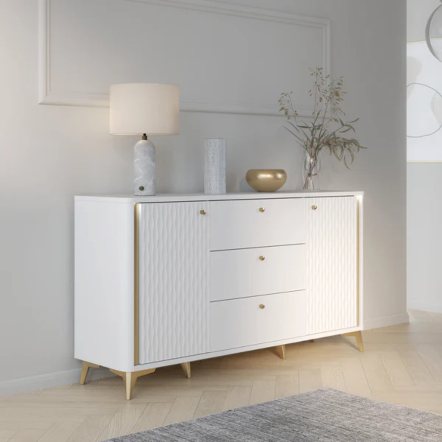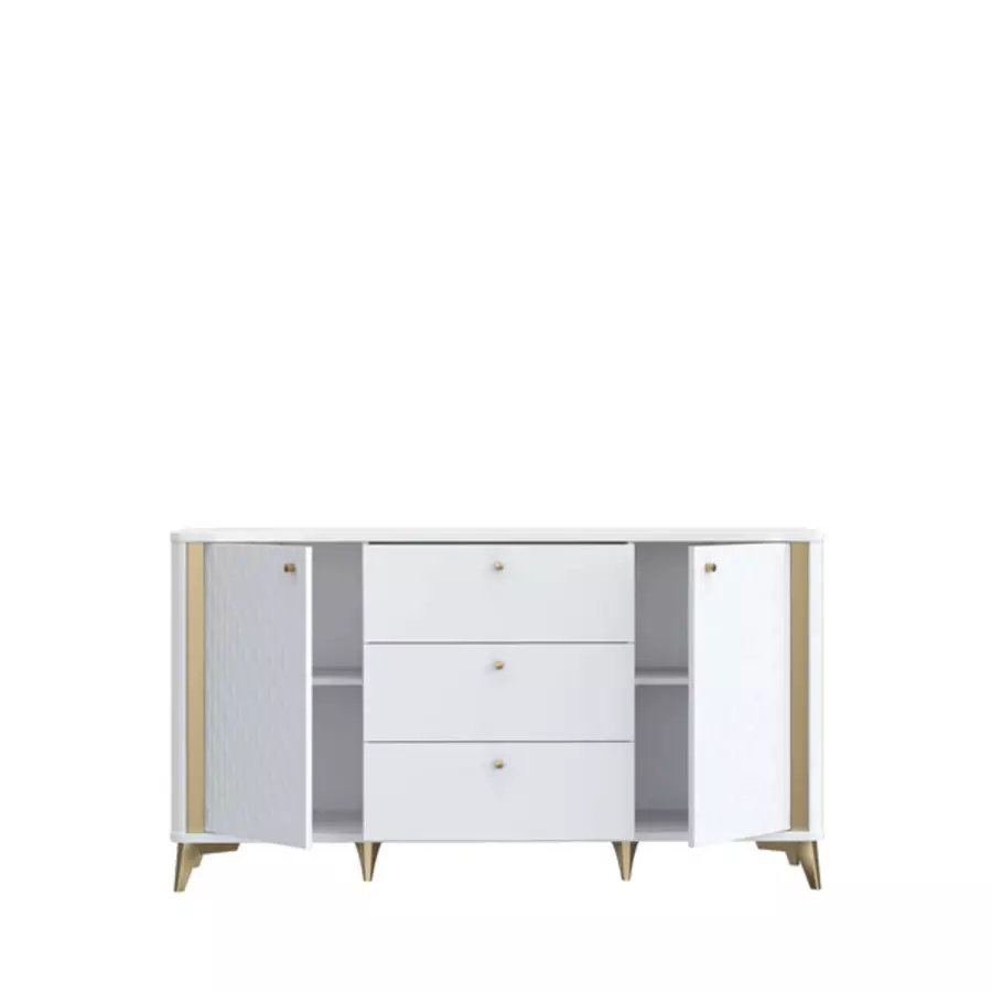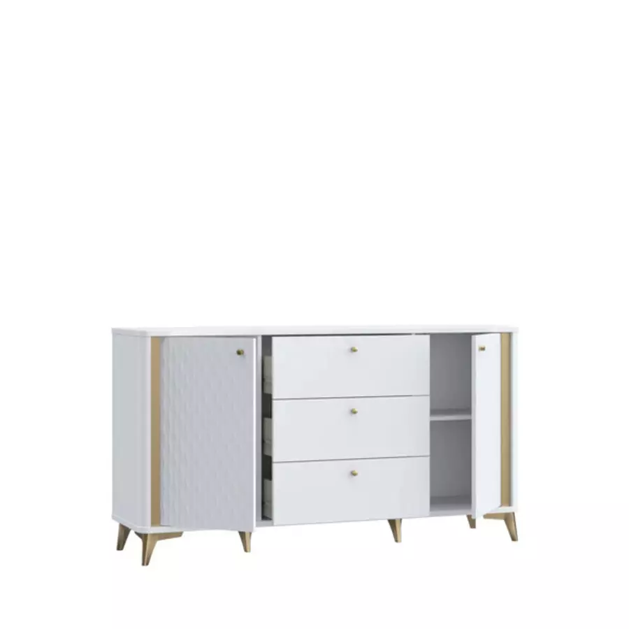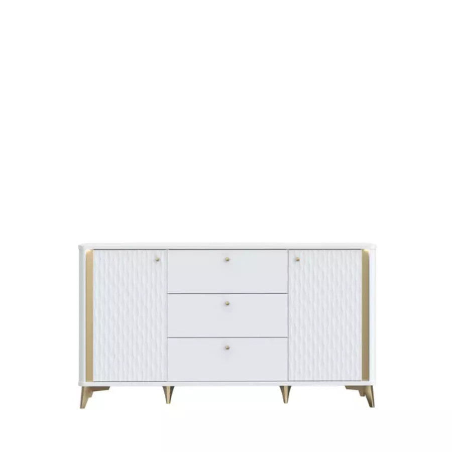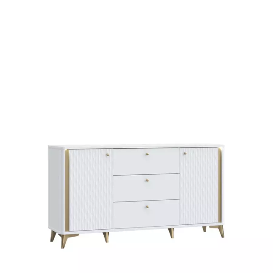 Бюфет ФОРЕСТ ХИЛС съчетава модерен дизайн и практичност. Изработен от висококачествено ламинирано ПДЧ, предлага удобно съхранение с просторни отделения и механизъм за плавно затваряне на вратите и чекмеджетата. Подходящ за съхранение и организация на различни вещи, той е перфектно допълнение към съвременния дом, като комбинира функционалност и изчистен естетически вид.