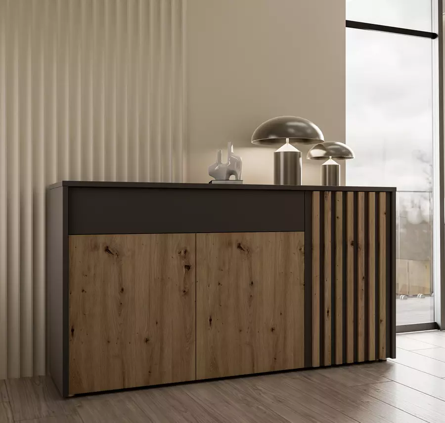 Изчистените линии и съчетанието на натурален дъб с графитен акцент придават на бюфета изтънчен и модерен вид. Този модел съчетава функционалност с елегантност, което го прави подходящ за различни интериорни решения – от класически до съвременни.