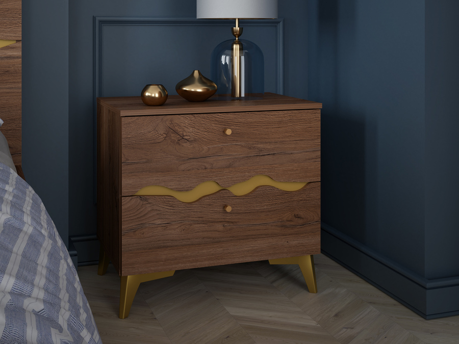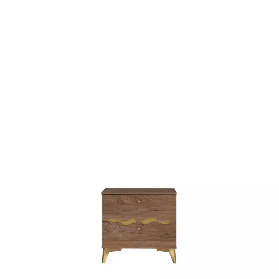 Шкафчето е вдигнато на стабилни метални крака с изискано златно покритие, които придават усещане за лукс и изтънченост. Тези крака не само добавят визуална лекота на дизайна, но и повишават практичността, като осигуряват лесно почистване под мебелта.