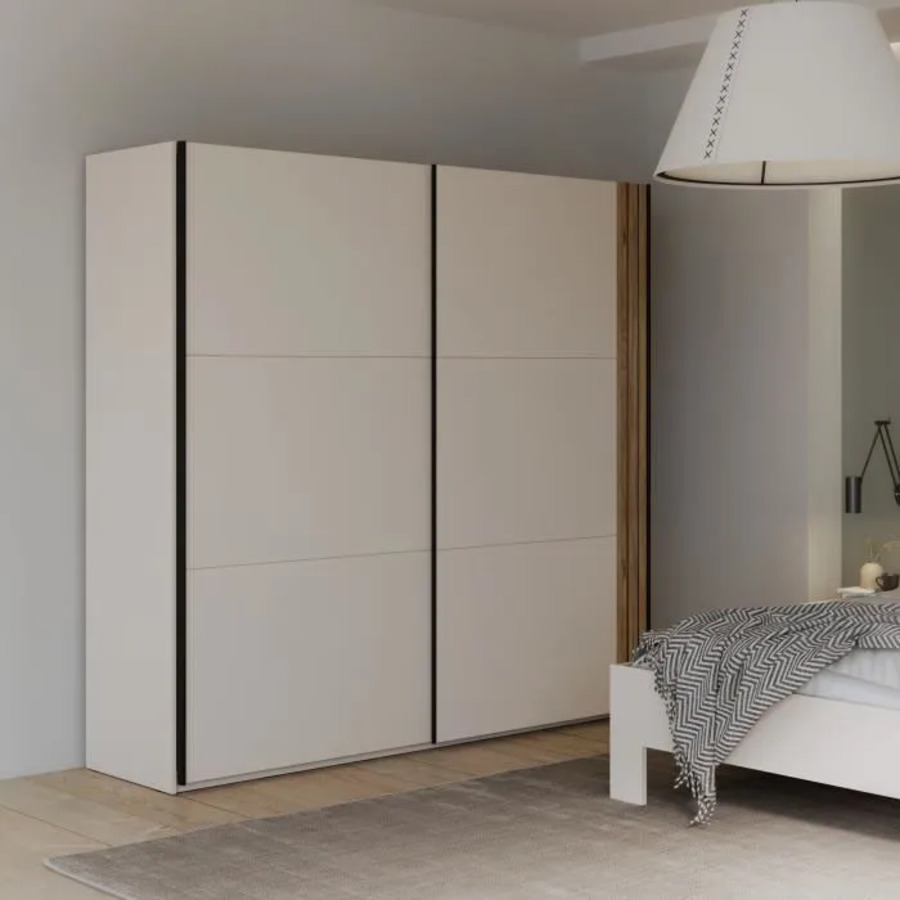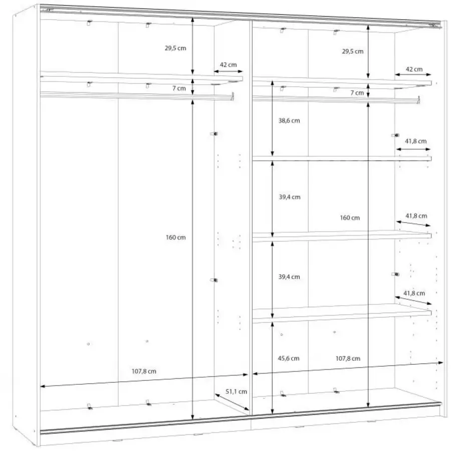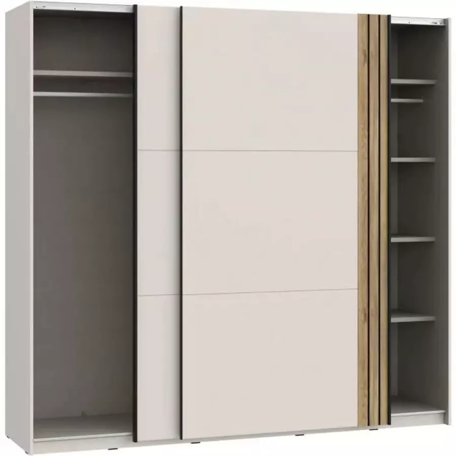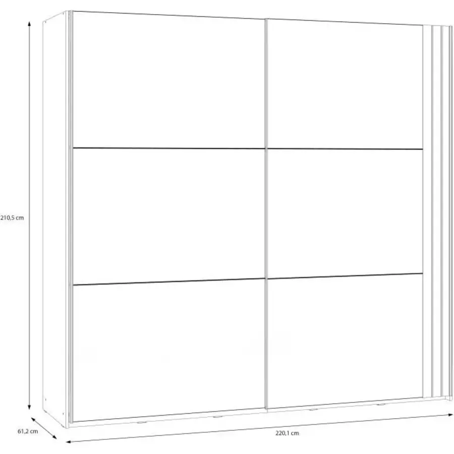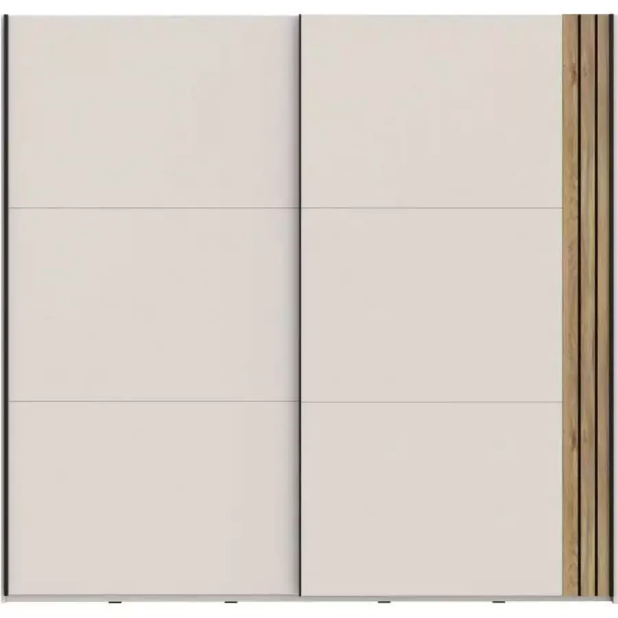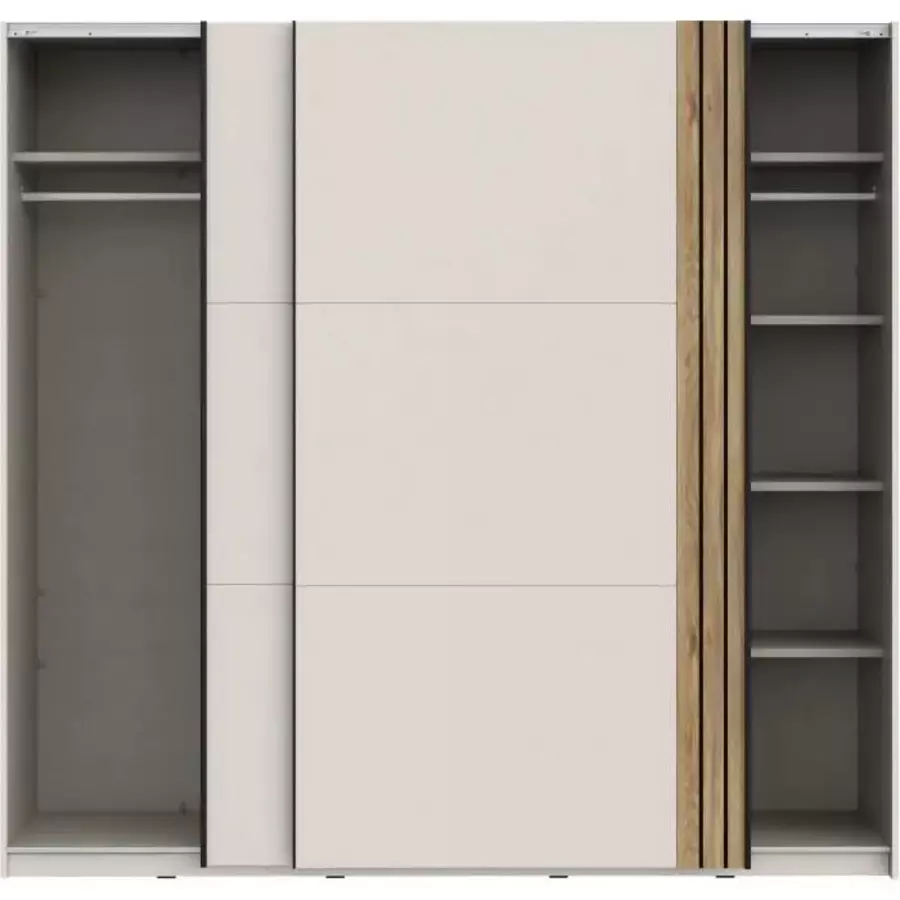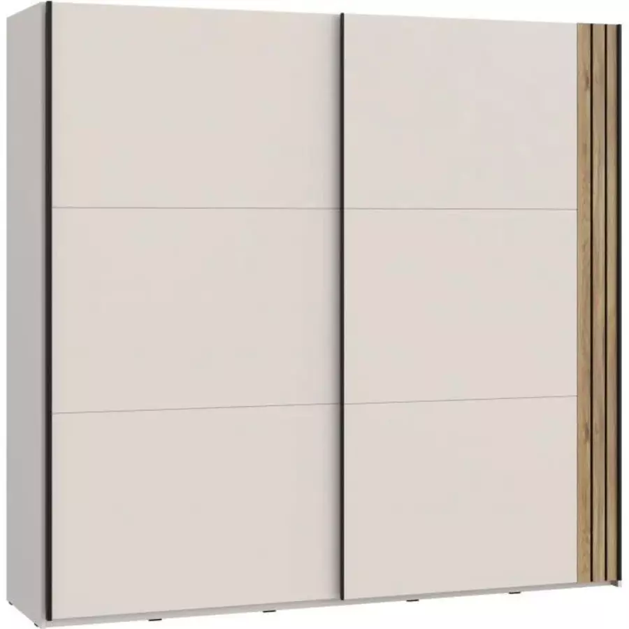 Изработен е от висококачествено ПДЧ, което осигурява стабилност, издръжливост и лесна поддръжка. Гардеробът разполага с плъзгащи врати, които спестяват пространство и осигуряват удобен достъп до вътрешното разпределение.