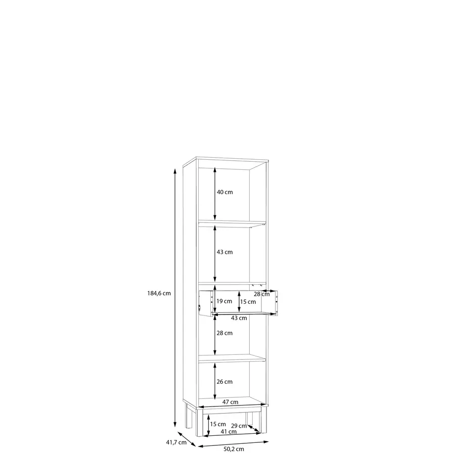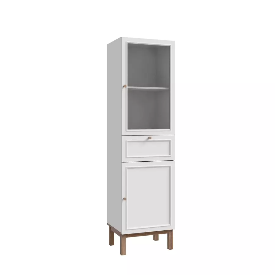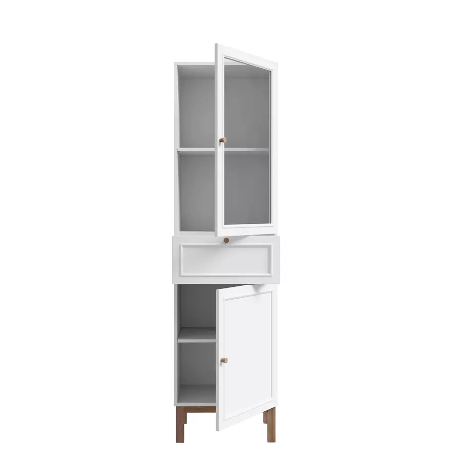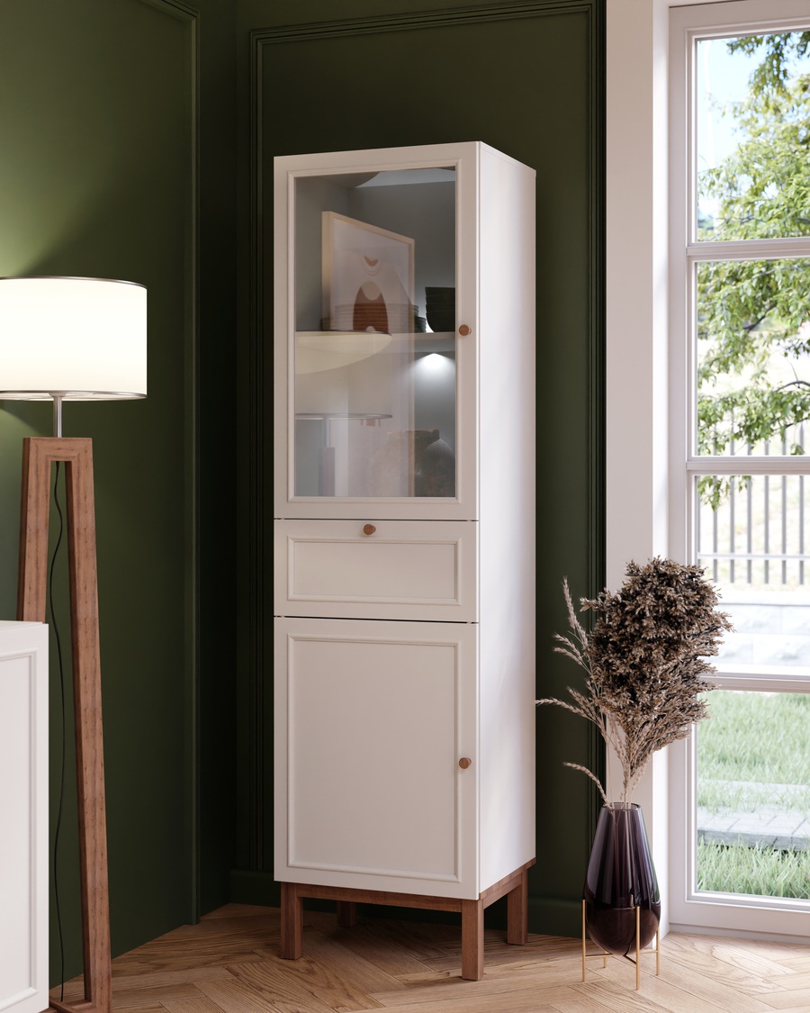 Витрината разполага с едно отделение с прозрачна стъклена врата, което предлага възможност за изложение на декоративни предмети като книги, съдове или сувенири. Зад стъклената врата има рафт, които осигуряват достатъчно място за подредба на вещи, като същевременно създават визуално леки и елегантни линии.