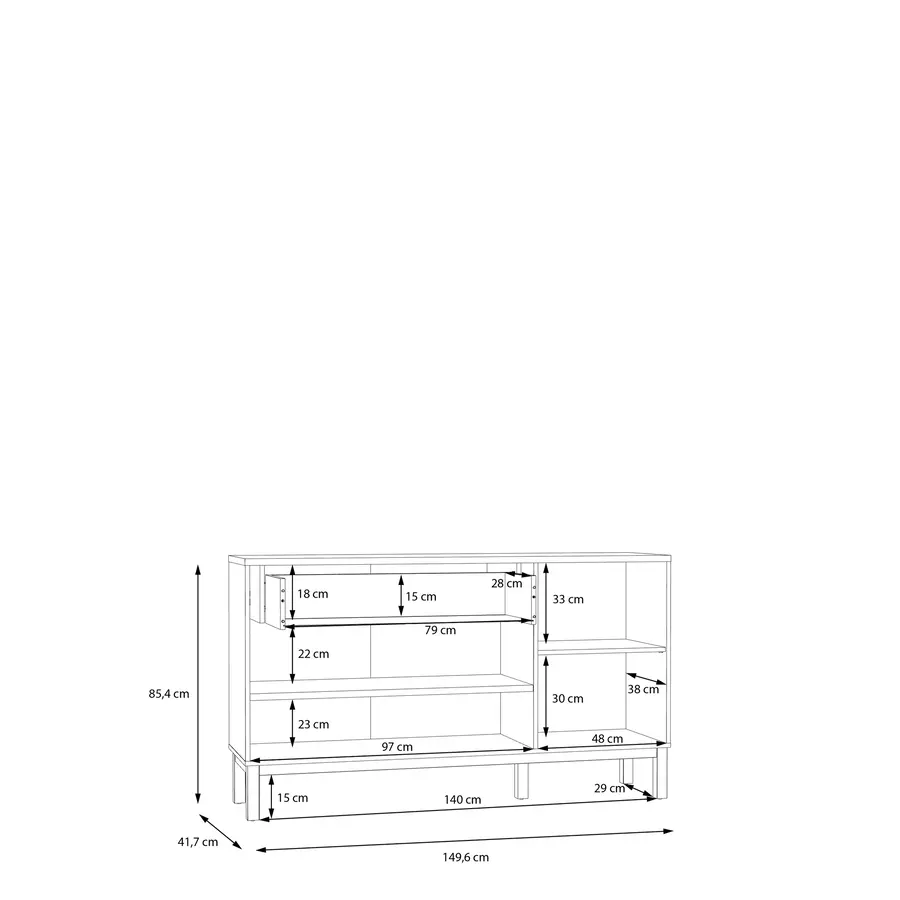 Бюфетът включва и два вътрешни рафта, които осигуряват допълнително място за подредба и организиране на вещите. Те предоставят гъвкаво пространство за различни нужди, което го прави практичен и удобен за използване в ежедневието.