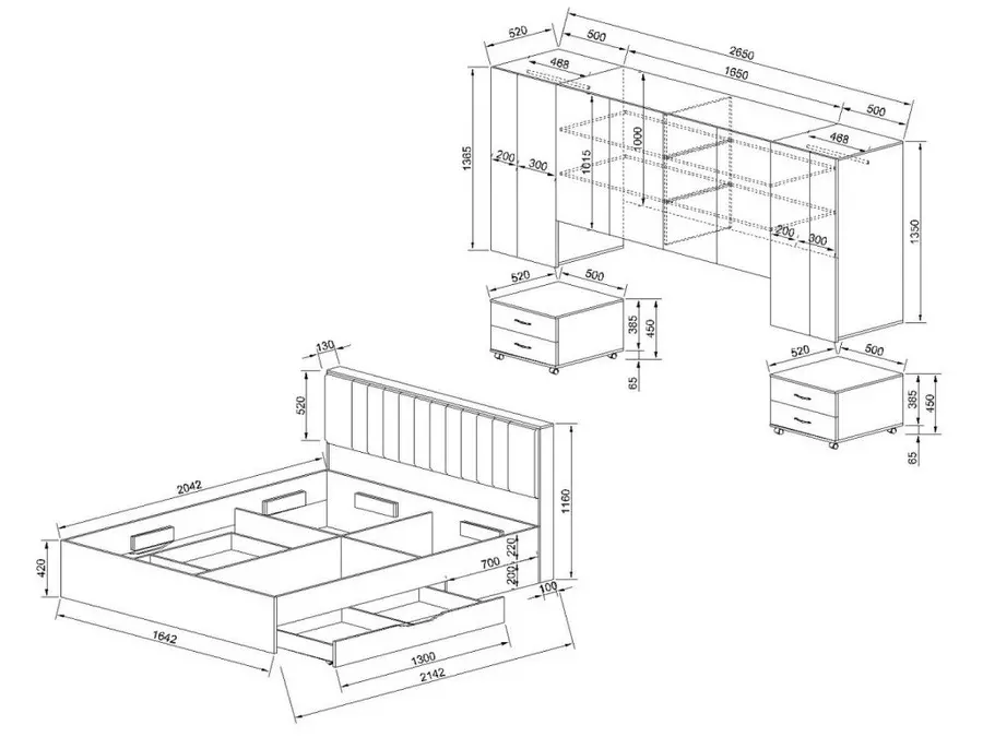 окачване на стена с рафтове и лостове. Нощни шкафчета с по две чекмеджета
