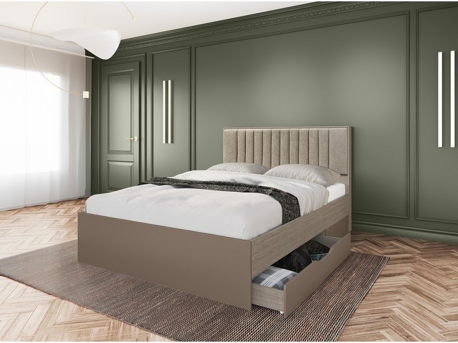 Легло с тапицирана табла СИТИ 2046 е удобно и практично легло за матрак 160/200 с високи лубове и тапицирана табла в бежова дамаска, две странично отварящи се чекмеджета за лесен достъп и управление на складовото пространство под матрака.