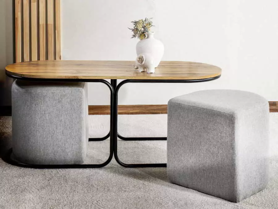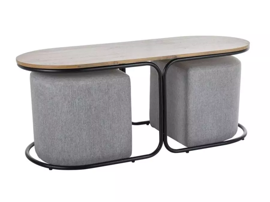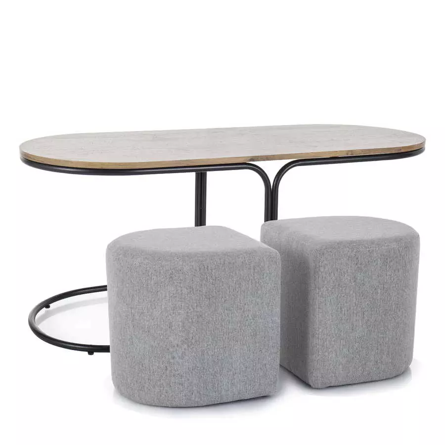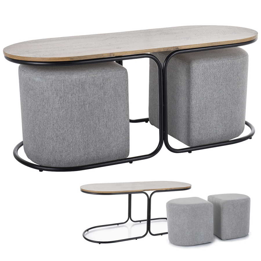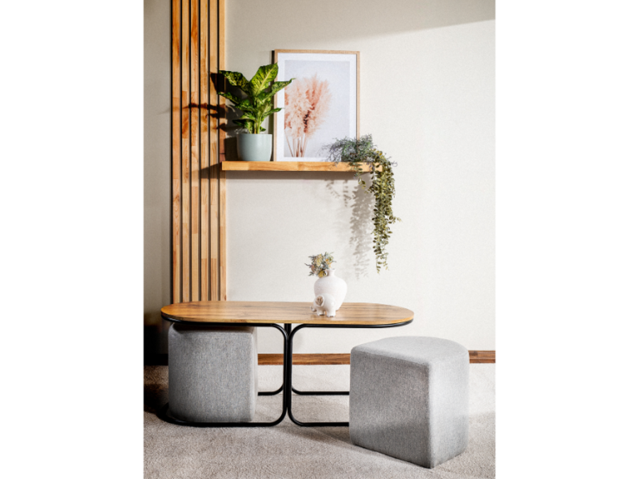 Холна маса ДУАЛ .Плота на масата е изработена от МДФ +фурнир в цвят занаятчийски дъб. Рамката и основата на масата са метални в цвят черен мат.Масата е изключително функционална за по-малки пространства поради наличието на две табуретки стоящи под плота тапициранив сив цвят.