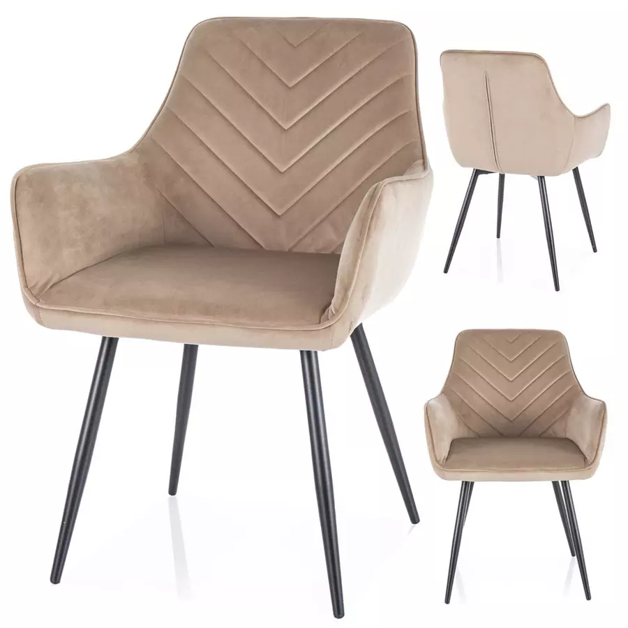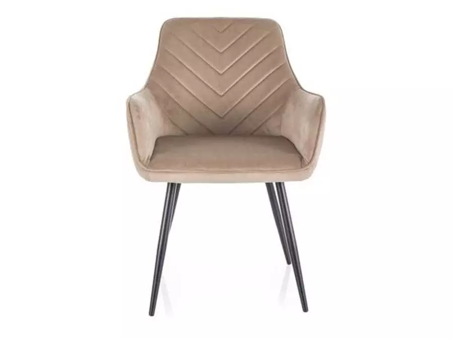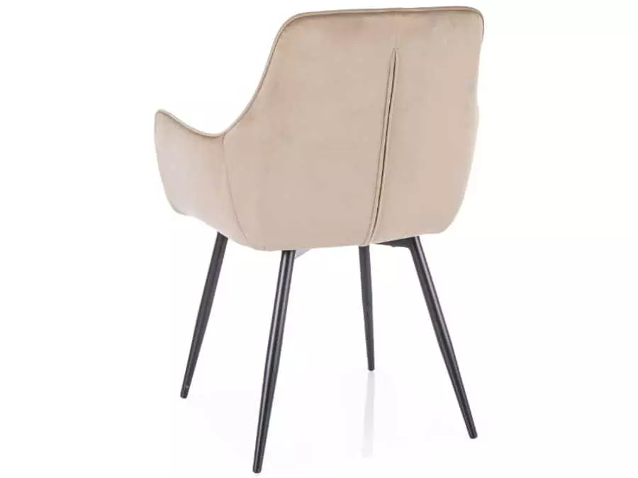 Здравата метална основа в черно матово покритие добавя стабилност и издръжливост, а минималистичният силует подчертава елегантния характер на креслото. Компактните му размери и универсалният дизайн го правят идеален избор за хол, офис, студио или модерна трапезария, като с лекота се вписва във всяко пространство и добавя стил и уют.