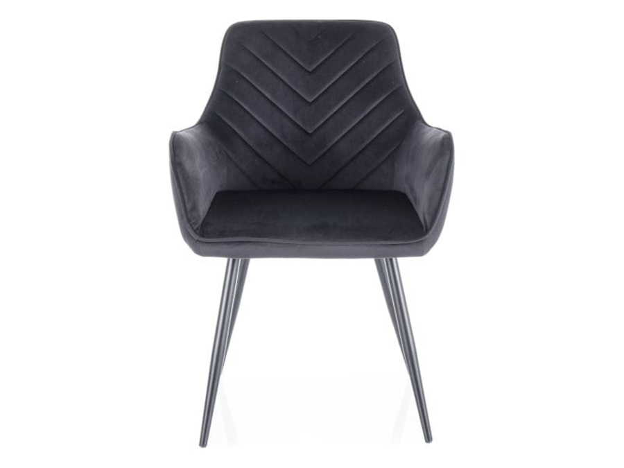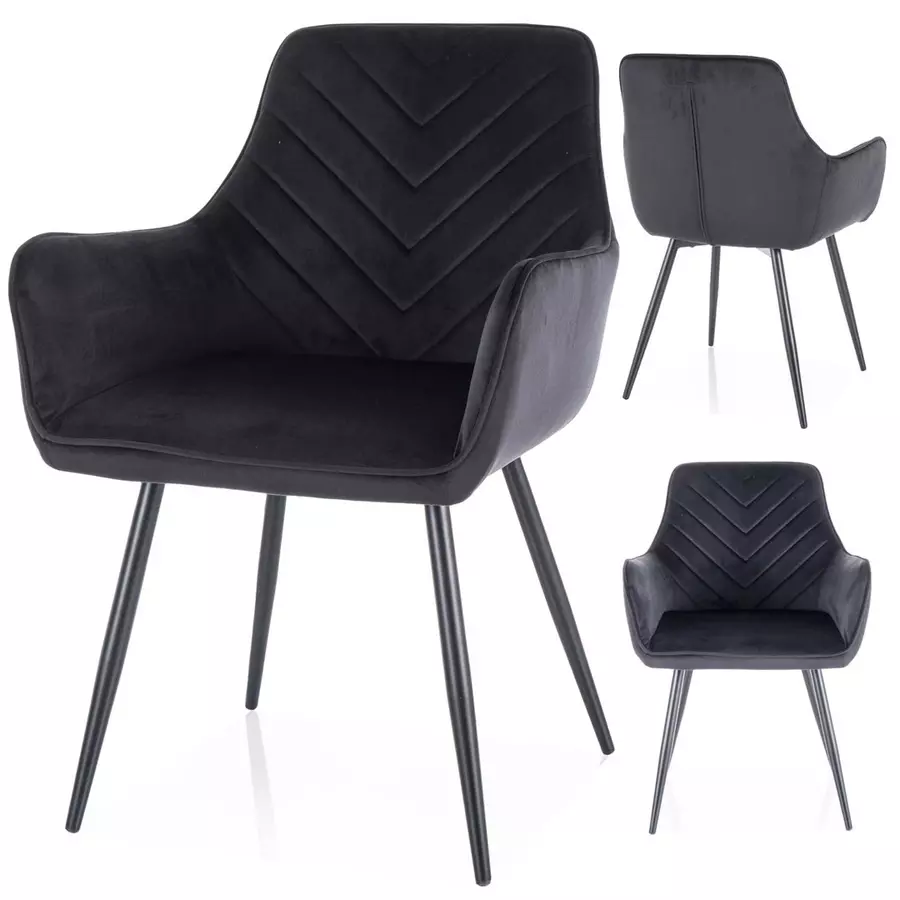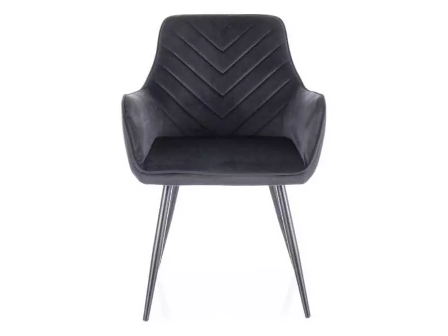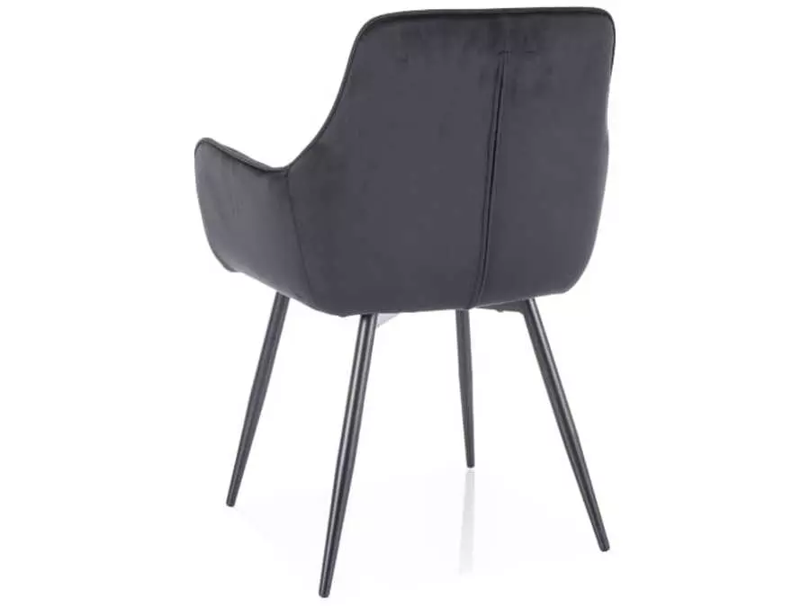 Здравата метална основа в черно матово покритие добавя стабилност и издръжливост, а минималистичният силует подчертава елегантния характер на креслото. Компактните му размери и универсалният дизайн го правят идеален избор за хол, офис, студио или модерна трапезария, като с лекота се вписва във всяко пространство и добавя стил и уют.