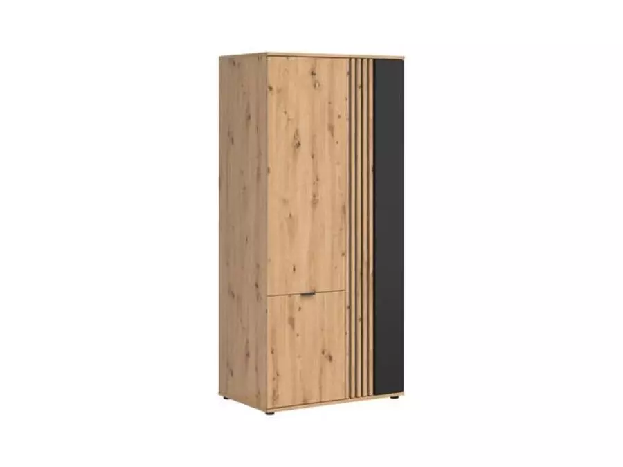 Дизайнът с три врати осигурява много място за съхранение на дрехи, обувки и аксесоари, което ви помага да поддържате новата си спалня подредена. Горната лява предна част се отваря с натискане за отваряне. Просторният интериор е оборудван с рафтове и релса за закачалки, за да можете да съхранявате както по-елегантни, така и ежедневни дрехи.