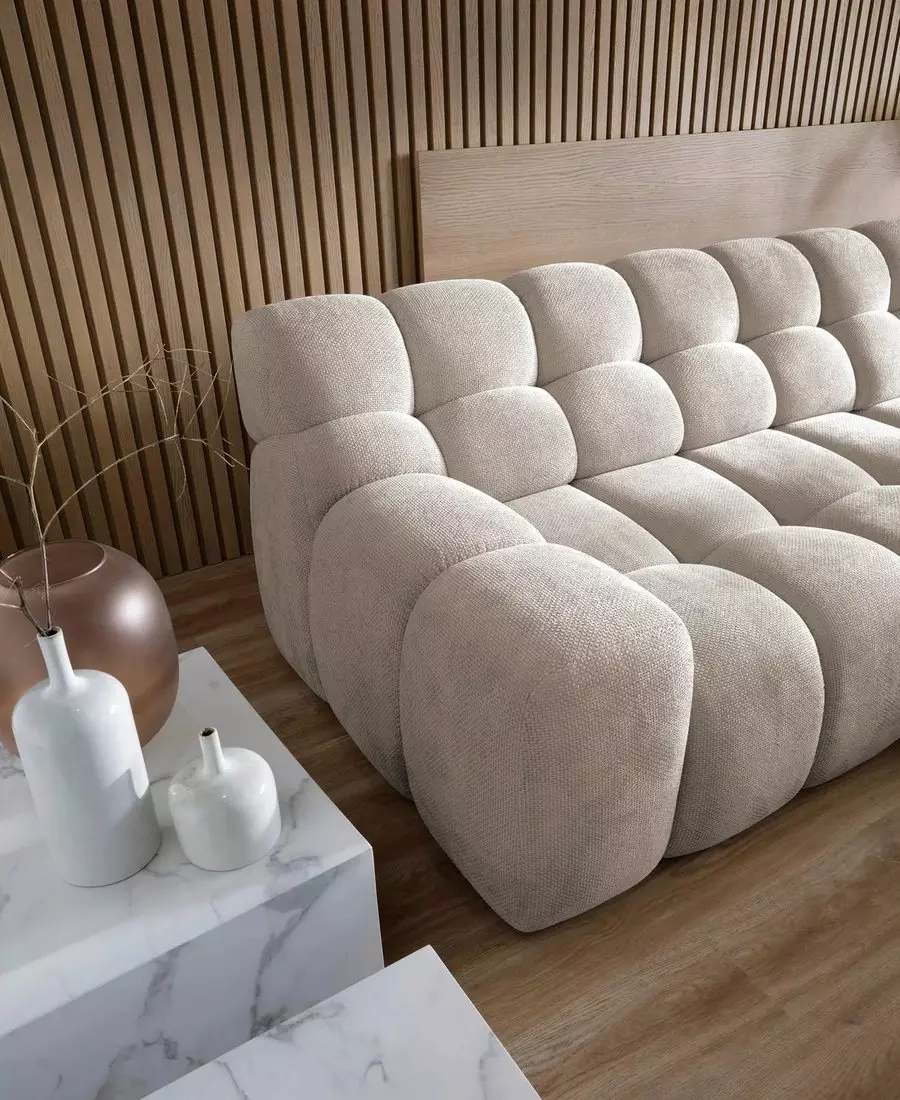 Седалката е изработена от високоеластична пяна и зиг-заг пружини, а облегалката – от пяна със същата плътност, което гарантира дълготраен комфорт. Диванът няма ракла, но впечатлява с модерна форма и изключително удобство.