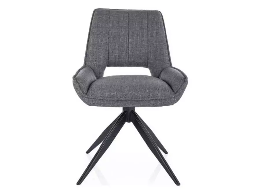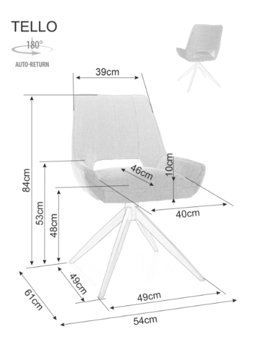 Трапезен стол Телло обединява съвременен дизайн с функционалност, като предлага елегантност и комфорт. Седалката, изработена от пяна и текстил, осигурява оптимален комфорт, а декоративните шевове и стилният прорез придават модерен вид. Столът се върти на 180°, което улеснява седенето и ставането без нужда от преместване. Черната метална основа осигурява стабилност и допълва съвременния облик на стола, който е идеален избор за модерни и лофт интериори.