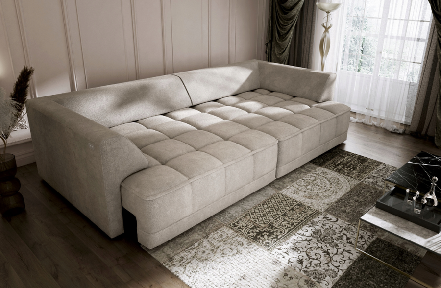 Диван ТИГА разполага с електрически разгъващи се седалки, като дълбочината се регулира според вашите нужди само с натискането на един бутон. Двете седалки се разтягат независимо една от друга до 27 см.