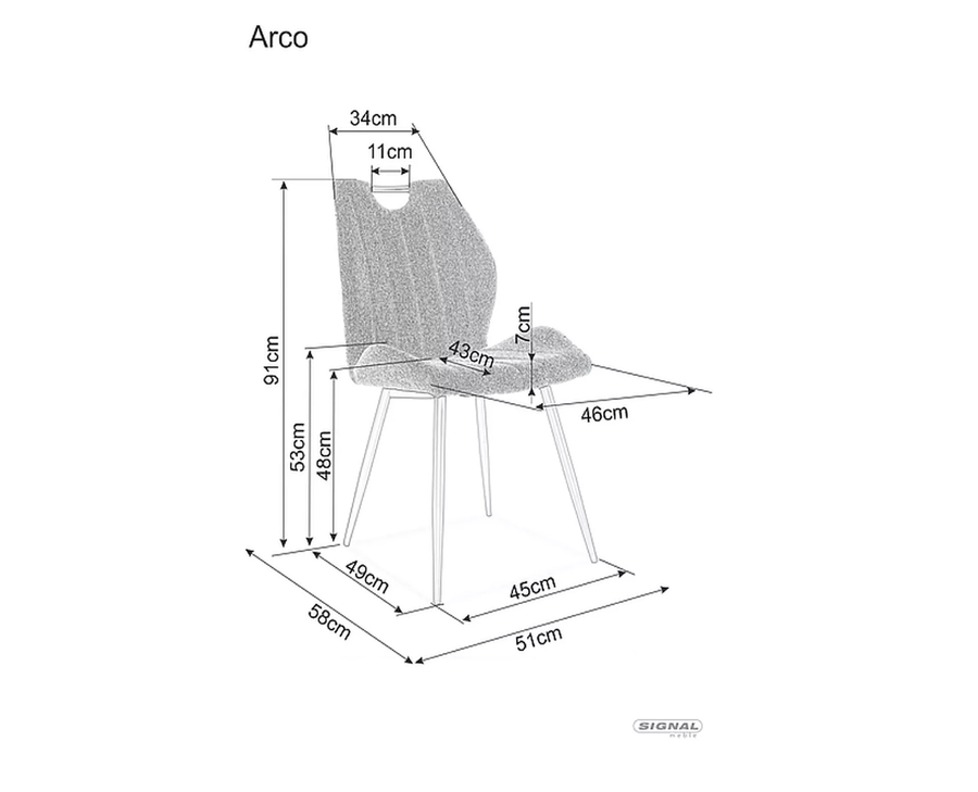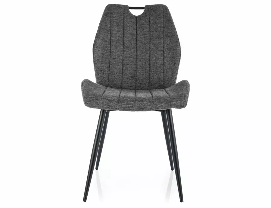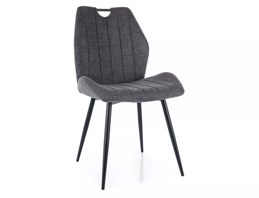 Трапезен стол АРКО е съчетание от модерен дизайн и практичност. Седалката от пяна, облечена с висококачествен текстил, и прави шевове създават стилна визия и комфорт. Черните метални крака със защитни тапички осигуряват стабилност и предпазват пода от надраскване. Максималното натоварване е 120 кг, което го прави издръжлив и подходящ за трапезарии, всекидневни и други съвременни интериори.