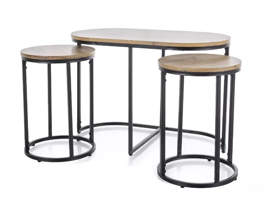 Елегантният комплект от три холни масички ТУИКС комбинира стил и функционалност, създавайки уникално допълнение към всяко пространство. Металната рамка в хармония с плотовете придава индустриален и модерен акцент на комплекта, като го прави подходящ както за малки, така и за по-просторни интериори.