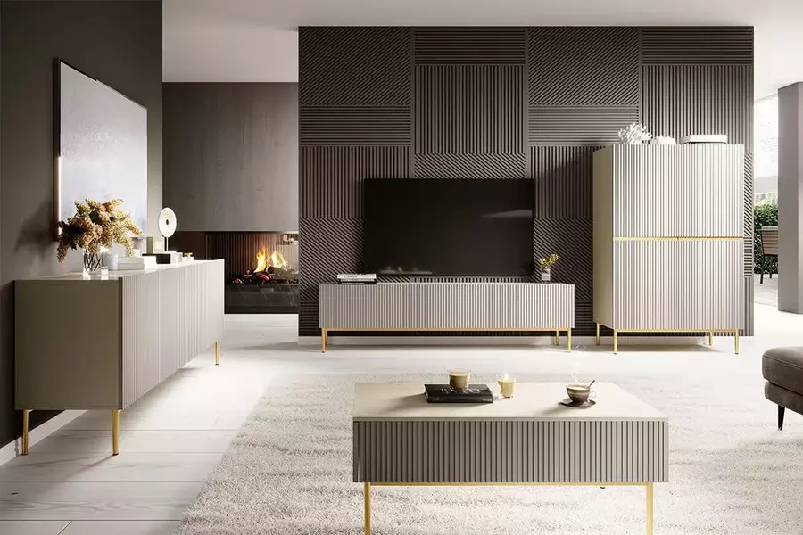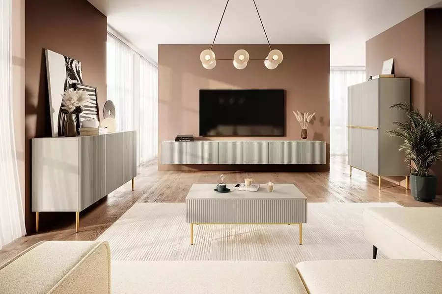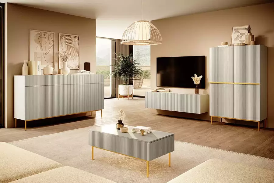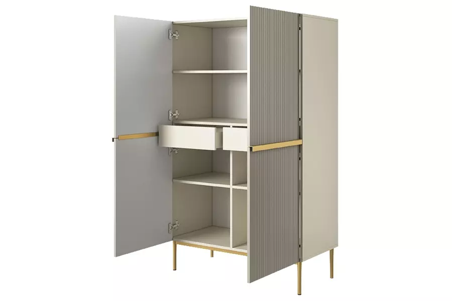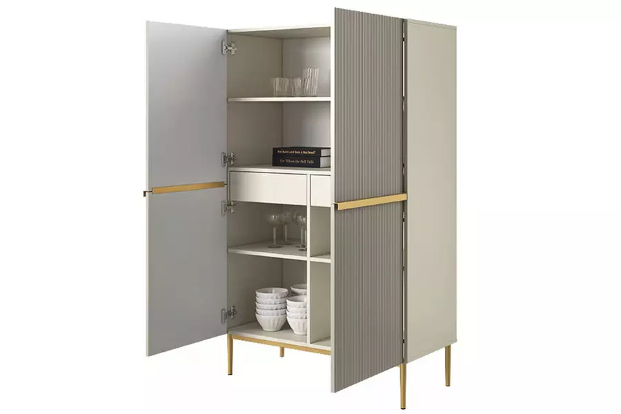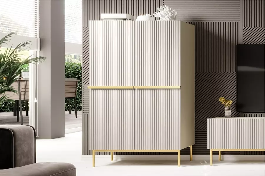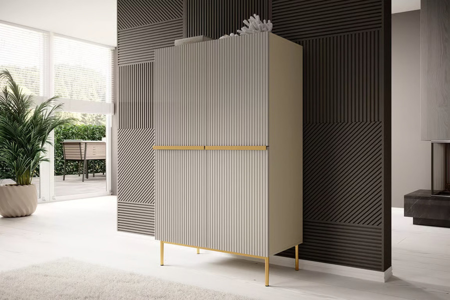 Корпусът е изработен от здраво ламинирано ПДЧ, осигуряващо дълготрайност и устойчивост на ежедневна употреба. Фронтовете са от висококачествен МДФ с фрезован декоративен мотив, който придава изтънчен характер и визуална дълбочина. Фино подбраните пропорции и линиите на дизайна подчертават съвременната и същевременно уютна стилистика на шкафа.