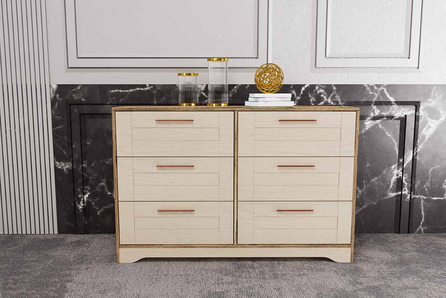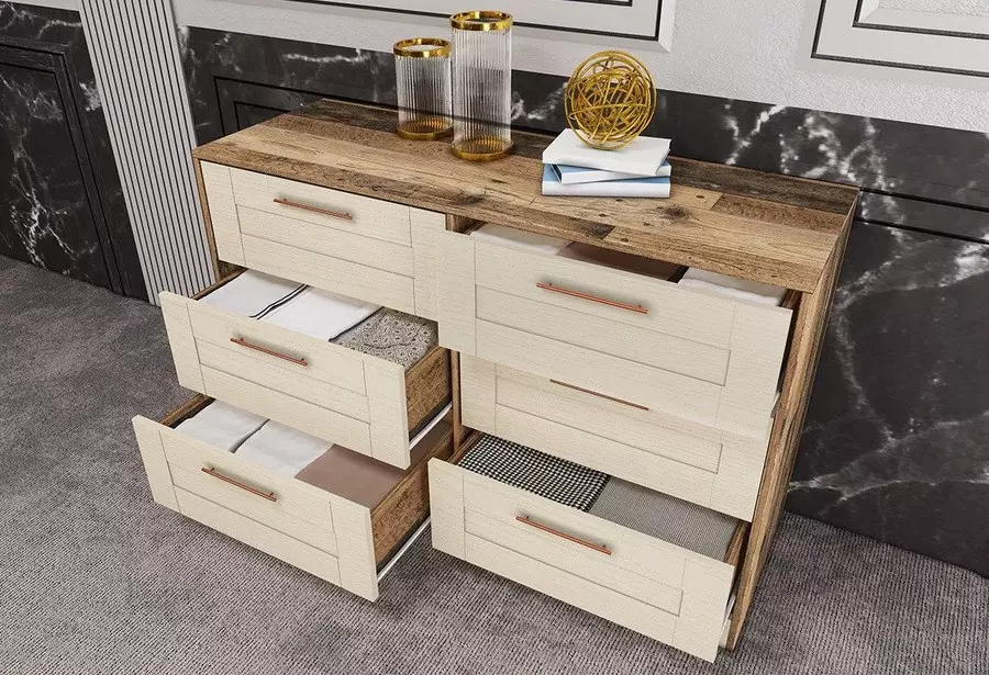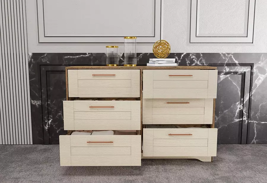 Скринът разполага с четири удобни чекмеджета, всяко оборудвано с механизъм за плавно затваряне. Тази функция предотвратява рязкото затваряне и износване на механизма, като добавя усещане за лукс и лекота при използване.