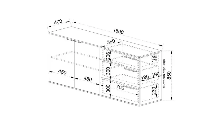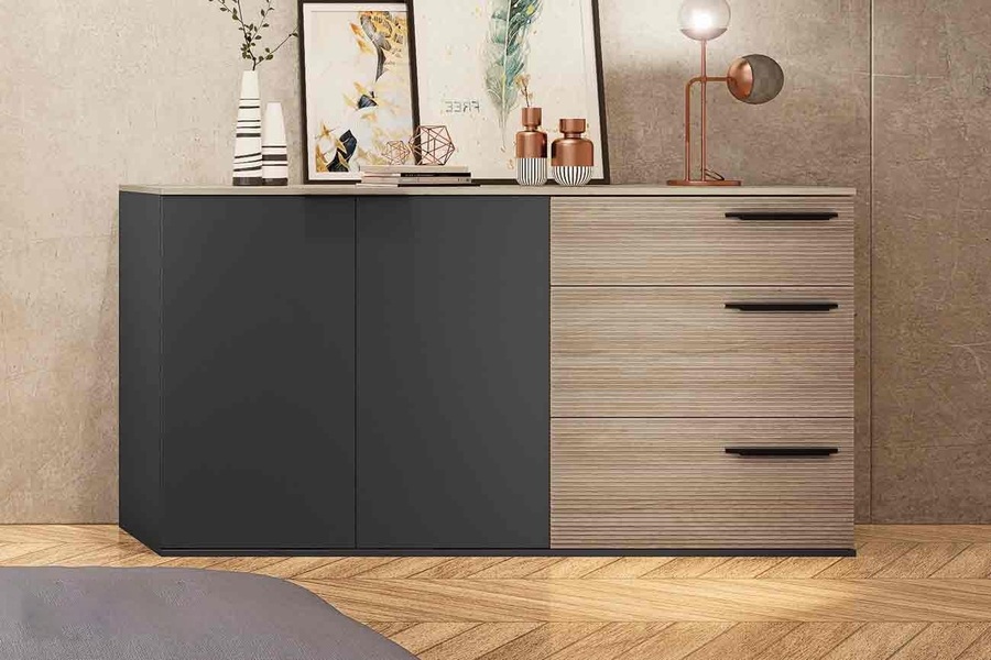 Здрав и устойчив корпус от 16 мм ламинирано ПДЧ осигурява стабилност и дълготрайна издръжливост на скрина. Идеален за ежедневна употреба. Вратите и челата на чекмеджетата са изработени от 18 мм фрезован МДФ, което придава масивен и стилен вид на скрина. Този детайл добавя класа и изисканост в интериора.