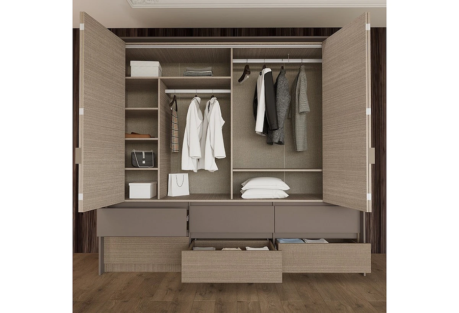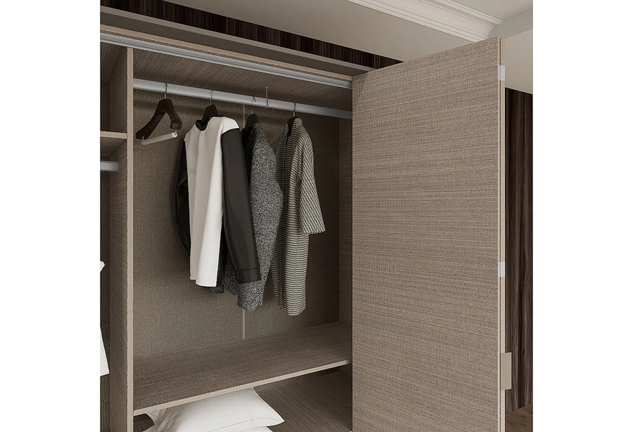 Гардеробът е изработен от 16 мм ПДЧ, осигуряващо дълготрайност и стабилност, подходяща за ежедневно ползване. Класическият дизайн с четири врати позволява лесен достъп до вътрешността на гардероба, осигурявайки удобство при подреждането и достъпа до дрехи и аксесоари. Гардеробът може лесно да се комбинира с други мебели от серия „Наутилус“, като легло с нощни шкафове и скрин, създавайки стилно и уютно пространство във вашата спалня.