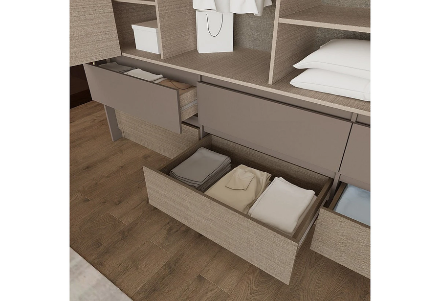 Гардеробът предлага достатъчно пространство за съхранение на различни вещи, включително рафтове и място за закачалки, което улеснява организацията и поддържането на ред в спалнята.