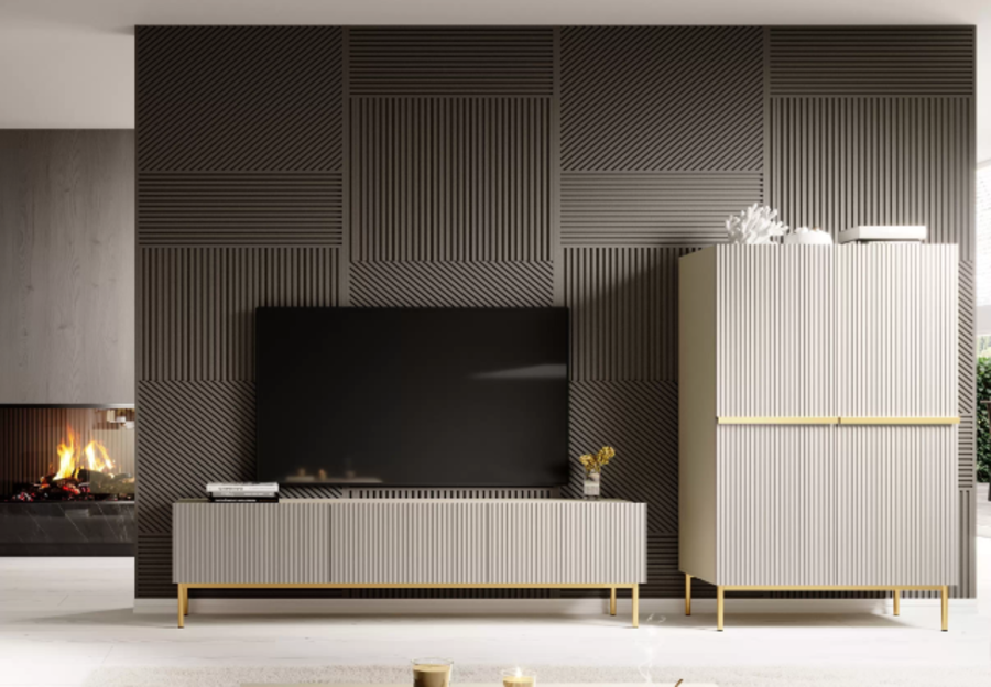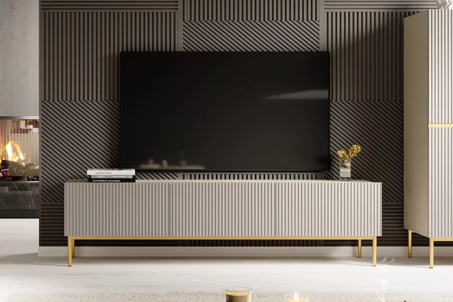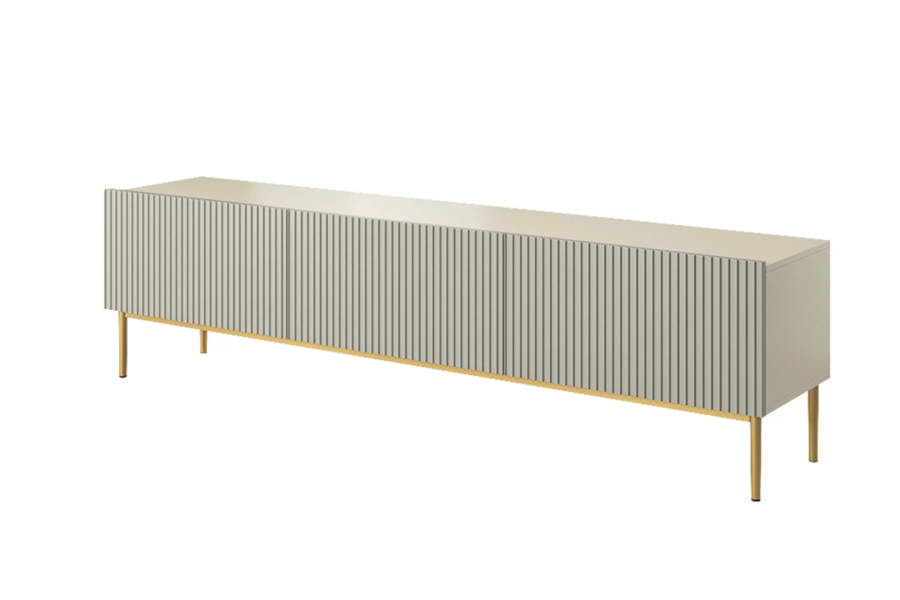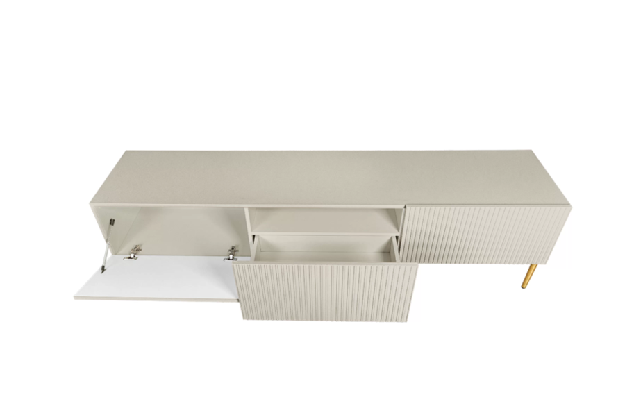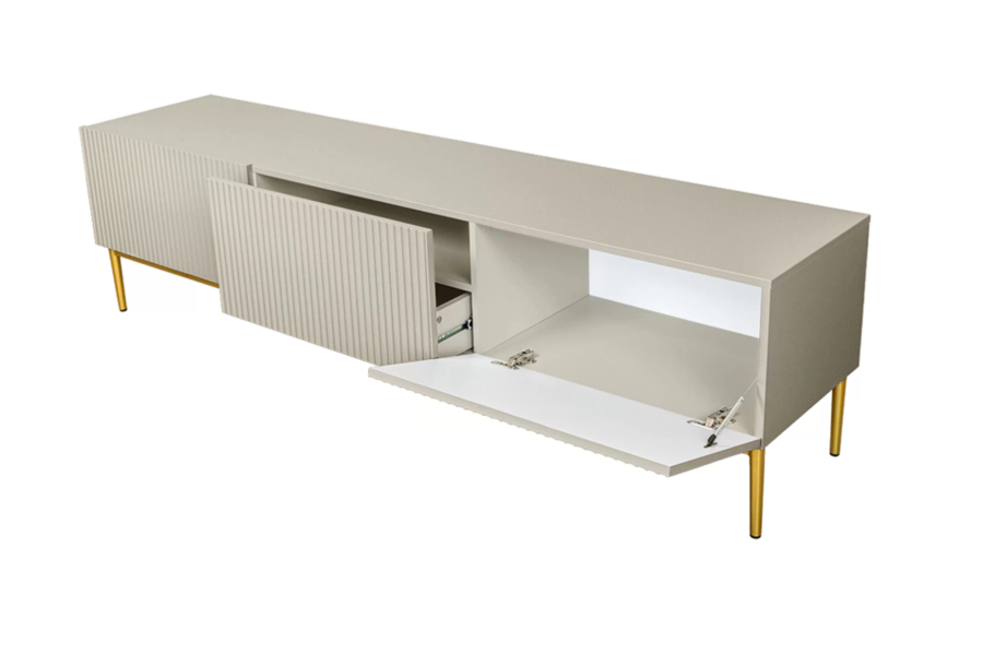 ТВ шкафът е изработен с корпус от ПДЧ, което осигурява стабилност и дълготрайна употреба. Материалът е издръжлив и запазва своята здравина при ежедневна употреба. Фронтовете на шкафа са от МДФ, което придава допълнителна здравина и усещане за масивност. Те са проектирани със стилен завършек, който допринася за цялостния луксозен вид на шкафа.