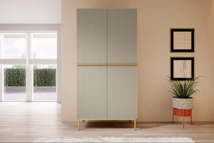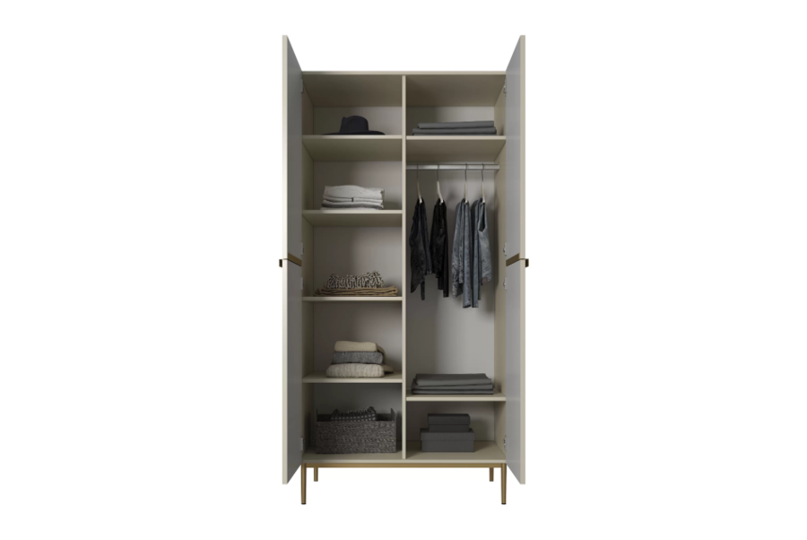 Гардеробът е издигнат върху метални крака в златисто, с височина 20 см, което улеснява почистването под него и добавя лекота и изящество към цялостната визия. Меката матова повърхност в цвят кашмир внася топлина и хармония в интериора, като същевременно запазва модерен и изискан облик.
