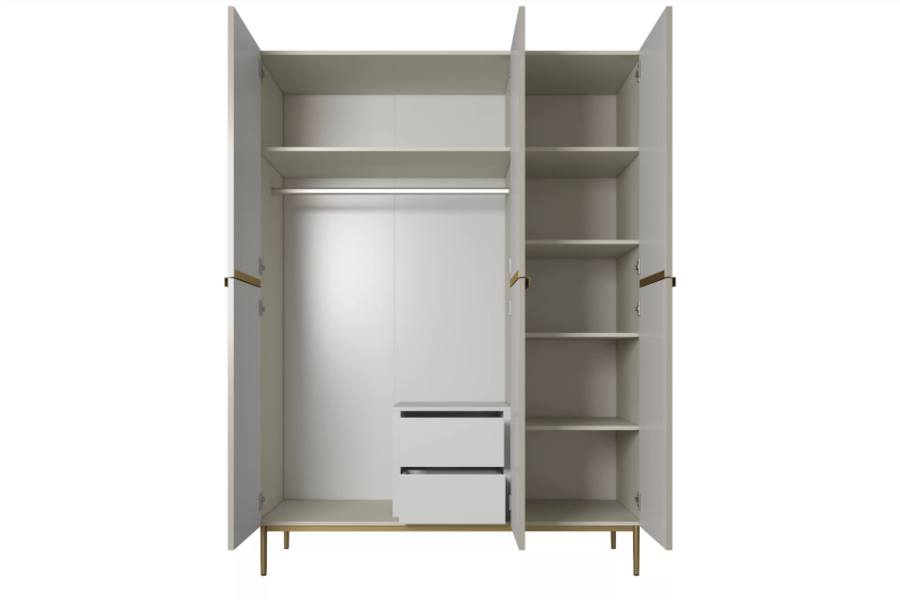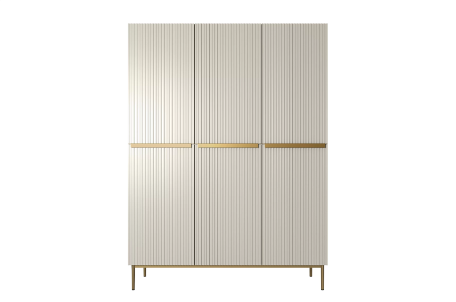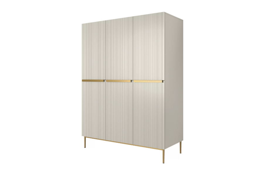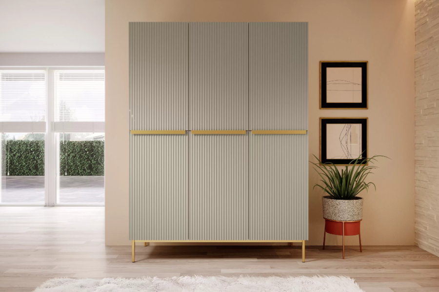 Изработен от 16 мм МДФ корпус, гардеробът предлага стабилност и издръжливост, осигурявайки дълготрайна употреба. Фронтовете на гардероба са изработени от 18 мм МДФ, придаващи масивност и здравина. Фрезованите врати добавят стил и характер на мебела и са оборудвани със златисти дръжки, което добавя луксозен акцент към дизайна на гардероба.