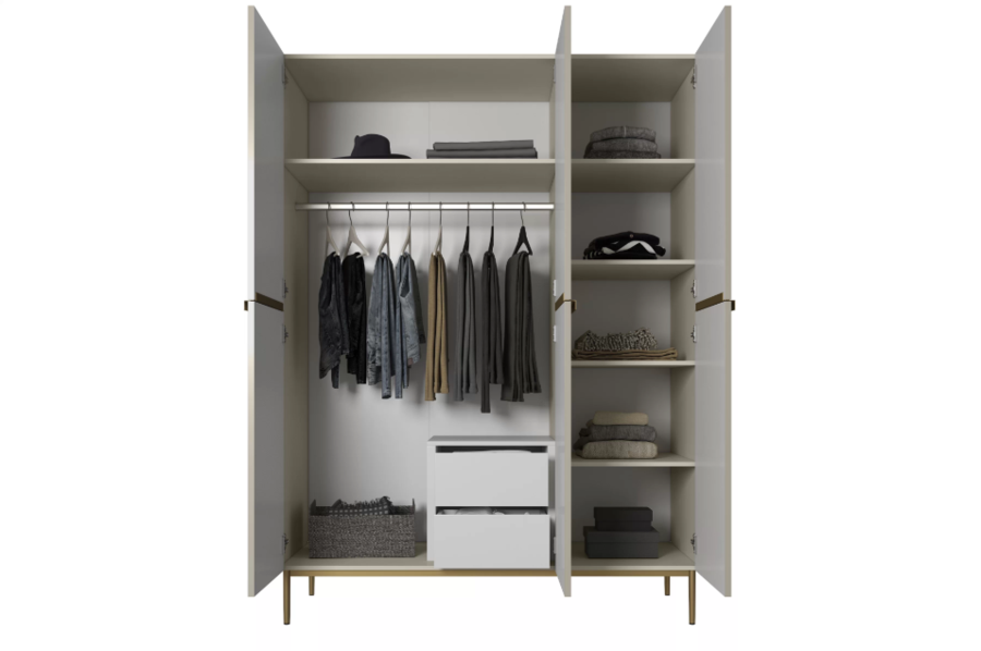 Гардеробът е поставен на крака с височина 20 см, което позволява лесно почистване под него и придава лекота на цялостния вид. Матовата повърхност в цвят кашмир внася топлина и стил, което прави гардероба лесно съчетаем с разнообразни интериорни решения.
