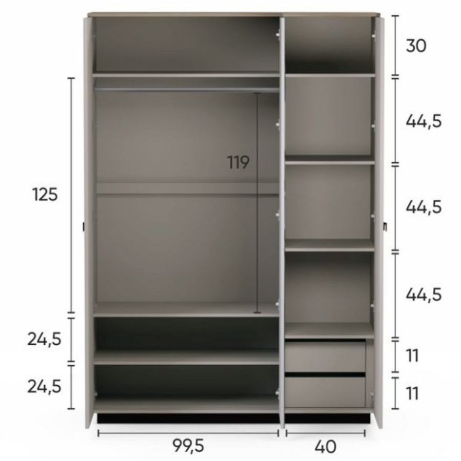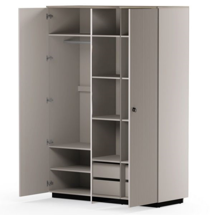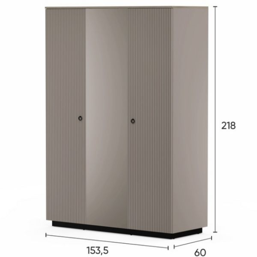 Гардероб ДОМИНИКА в цвят таупе с плот в нюанс дъб silverjack е стилно и практично решение за съхранение в съвременния дом. Фронтовете са изработени от MDF плоскост,което гарантира здравина и дълготрайност. Плотът в цвят дъб silverjack придава естествен вид и допълва модерния облик на гардероба.Този гардероб съчетава изтънченост и функционалност, подходящ за съвременни и елегантни интериори.