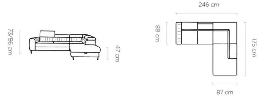 Ъглов диван НАВАС L съчетава практичност и стил, за да осигури максимален комфорт и функционалност в компактно пространство. Изработен е от изключително мек текстил, който придава уют и естетика на всяка всекидневна. Диванът разполага с удобна функция сън, която лесно се трансформира в легло с размери 191х115 см – идеален за гостите или за ежедневна употреба.