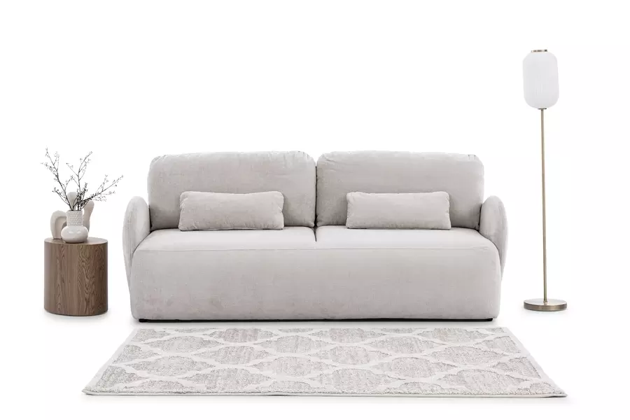 С функция за сън и площ от 197х154 см, този диван предлага удобно място за спане на гости или за релаксация. Неговите ефектни подлакътници придават допълнителен характер и естетика, съчетавайки практичност и изискан външен вид. Издигнат е на ниски крачета, които осигуряват стабилност и улесняват поддръжката на мебела.