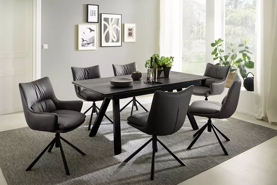 Металните крака в черен мат придават елегантен и стабилен вид, като същевременно осигуряват надеждна конструкция и устойчивост. Уникалното предимство на Трапезен стол Ерко S е вграденият механизъм за завъртане на 360°, който осигурява допълнително удобство и свобода на движение. Благодарение на съчетанието между функционалност и модерен дизайн, този стол е отличен избор както за трапезарията, така и за офис или стилно обзаведено заведение.