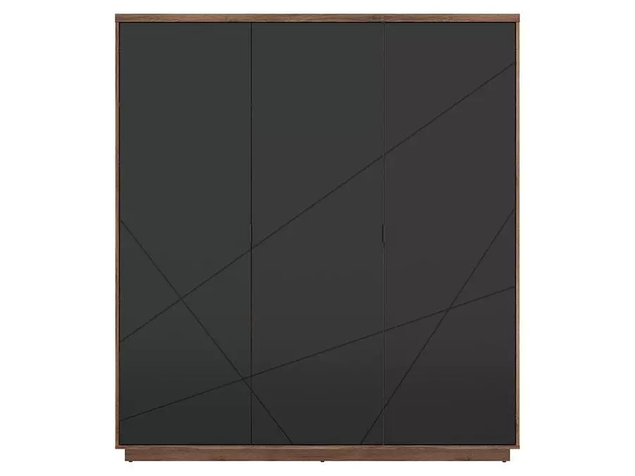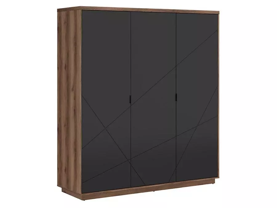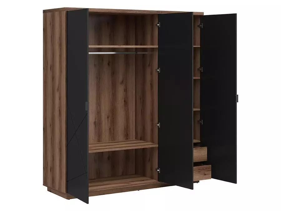 Трикрилният гардероб разполага с оптимално разпределение на пространството: в дясната част има две чекмеджета и четири рафта, а в лявата, зад двете врати – два рафта и лост за закачалки. Това осигурява удобство при организиране на дрехи и аксесоари. Всички модули в системата са оборудвани с механизъм за плавно затваряне на вратичките и чекмеджетата, осигуряващи тишина и спокойствие.