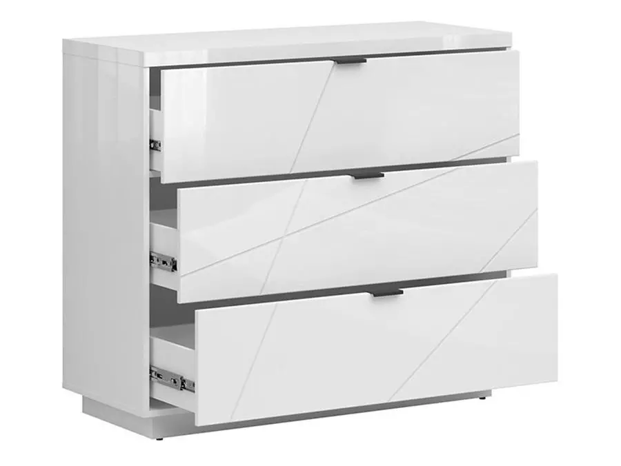 Скринът разполага с три дълбоки и функционални чекмеджета, осигуряващи достатъчно пространство за съхранение. Всички модули от системата са снабдени с механизъм за плавно затваряне, което прави използването им безшумно и създава спокойна атмосфера у дома.