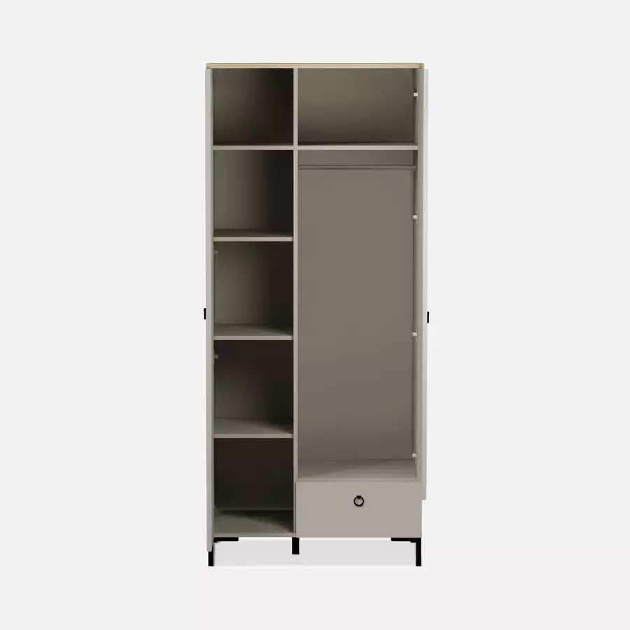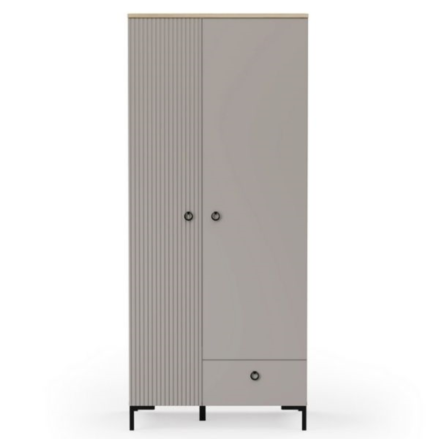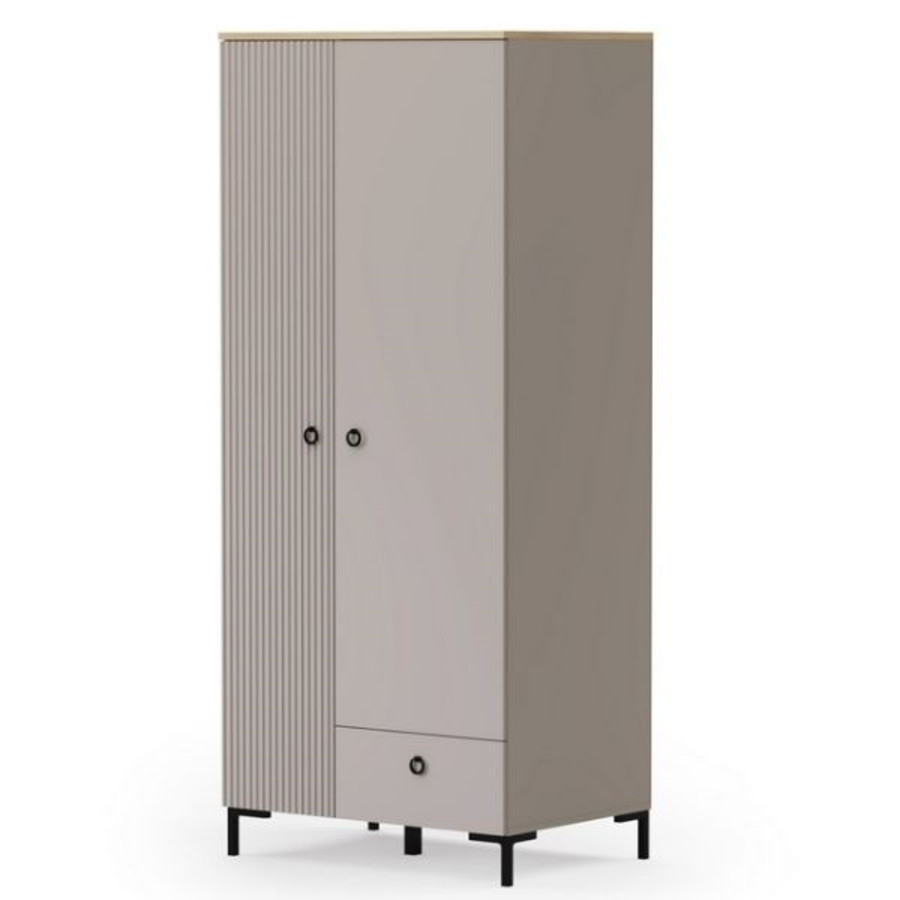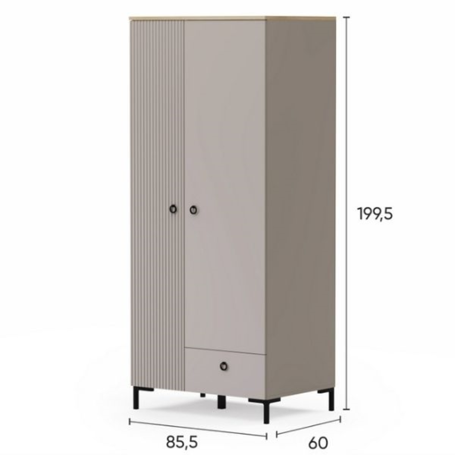 Гардероб ДОМИНИКА в цвят таупе с плот в нюанс дъб silverjack е стилно и практично решение за съхранение в съвременния дом. Фронтовете са изработени от MDF плоскост,което гарантира здравина и дълготрайност. Плотът в цвят дъб silverjack придава естествен вид и допълва модерния облик на гардероба.Този гардероб съчетава изтънченост и функционалност, подходящ за съвременни и елегантни интериори.