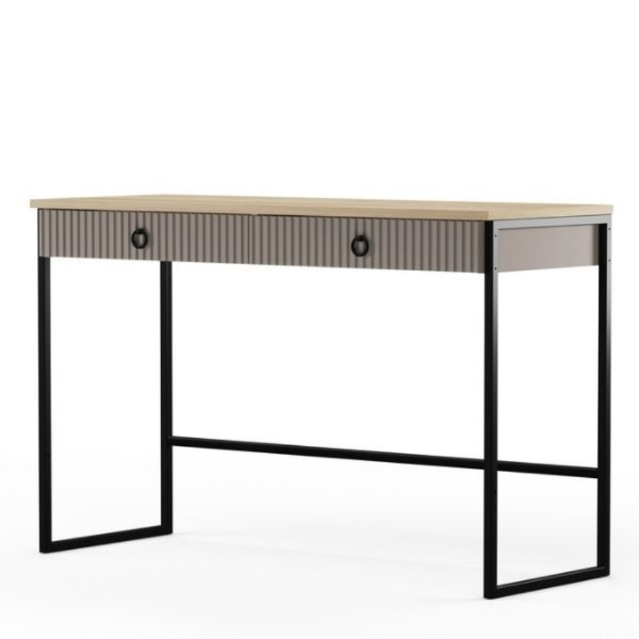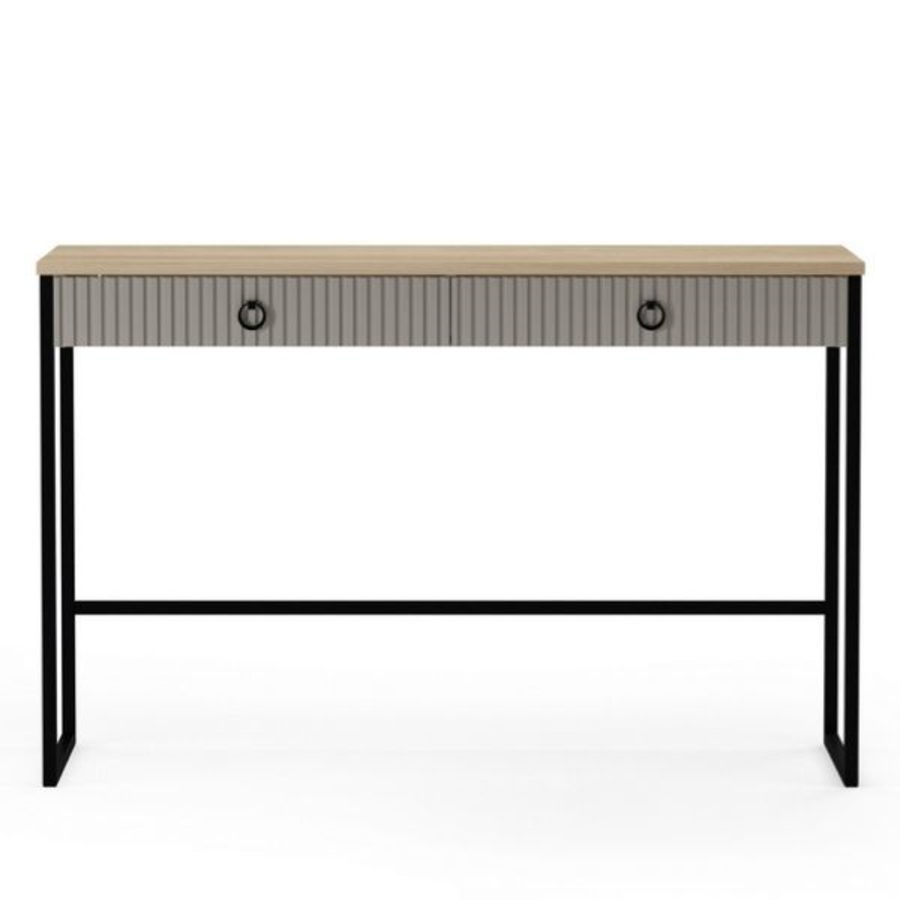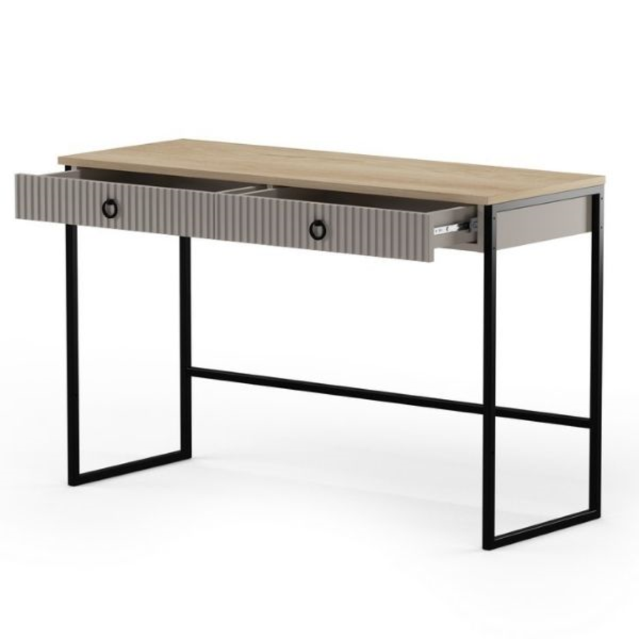 Тоалетката ДОМИНИКА предлага стил и практичност в едно. Със своите две просторни чекмеджета, тя осигурява достатъчно място за съхранение. Изработена в модерен цвят таупе и дъб "Silverjack", тоалетката се вписва чудесно в съвременния интериор. Металните дръжки и изчистеният дизайн я правят стилен акцент във всяка спалня.