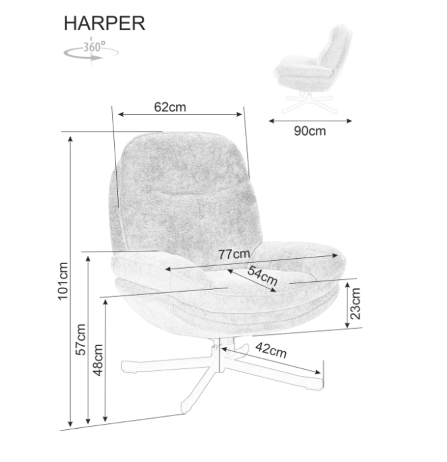 Основата е изработена от закалена стомана с прахово боядисано черно покритие, което добавя здравина и стабилност, докато допълва модерния му дизайн. Фотьойл ХАРПЪР съчетава стил, функционалност и комфорт, превръщайки го в отличен избор за всяко жилище.