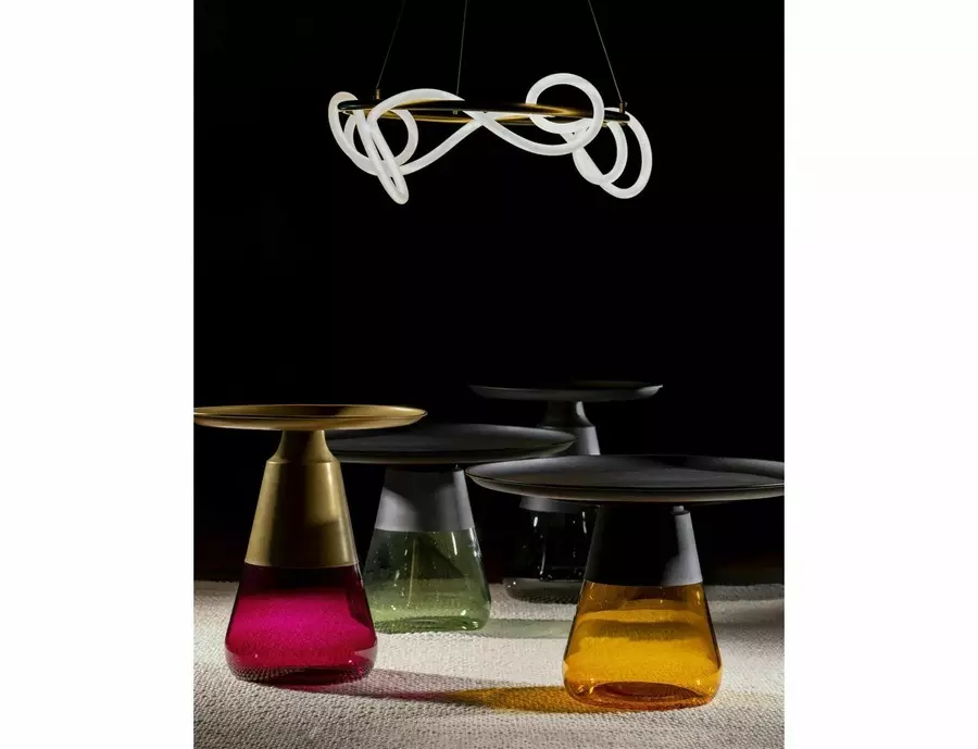 Основата на масата, изработена от прозрачно цветно стъкло, добавя динамика и визуална привлекателност, като създава игра на светлина и нюанси. Плотът, изработен с изключителна прецизност, подчертава съвременния ѝ характер, като същевременно осигурява стабилност и практичност. Всички елементи са хармонично съчетани, за да създадат балансиран и стилен продукт.