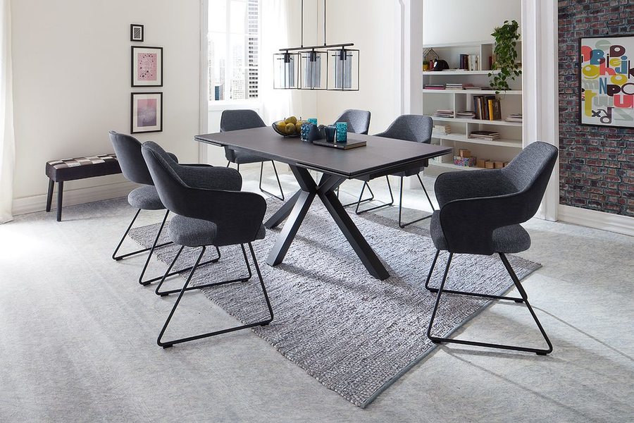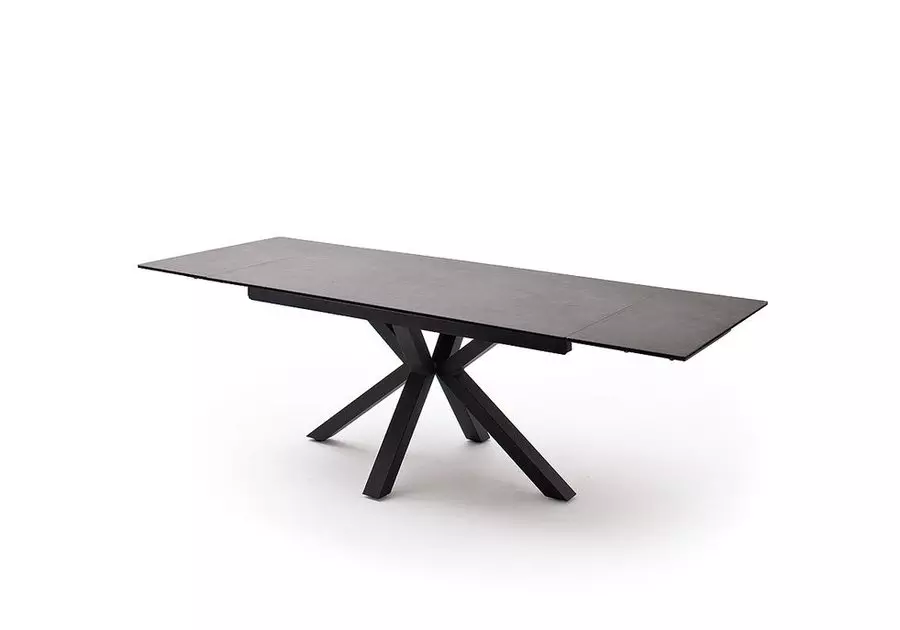 Трапезната маса НАГАНО впечатлява с модерен дизайн и функционалност, подходяща за стилен интериор. Плотът е изработен от висококачествена керамика в цвят антрацит, комбиниран с база от закалено стъкло, което добавя изтънченост и устойчивост. Масивните, подсилени стоманени крака в черен мат гарантират стабилност и елегантен вид. В прибрано състояние, плотът е с дължина 160 см, но лесно може да бъде удължен благодарение на двата независими механизма за разтягане. Всеки от тях добавя по 40 см, като в разтегнато положение дължината на масата достига до 240 см, осигурявайки допълнително място за големи събирания.
