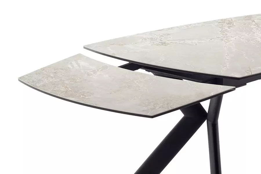 Плотът на масата впечатлява със своя изтънчен ръждив ефект, който придава уникален характер и допринася за усещане за топлина и уют. Неговата заоблена форма добавя елегантност, а керамичната повърхност осигурява издръжливост и лесна поддръжка. Масата разполага с разтегателен механизъм от двата края, който ви позволява да адаптирате размера ѝ според вашите нужди. В прибрано състояние дължината е 180 см, а с удължаване на двата края, всеки с по 40 см, тя достига впечатляващите 260 см, подходящи за големи събирания и семейни празници.